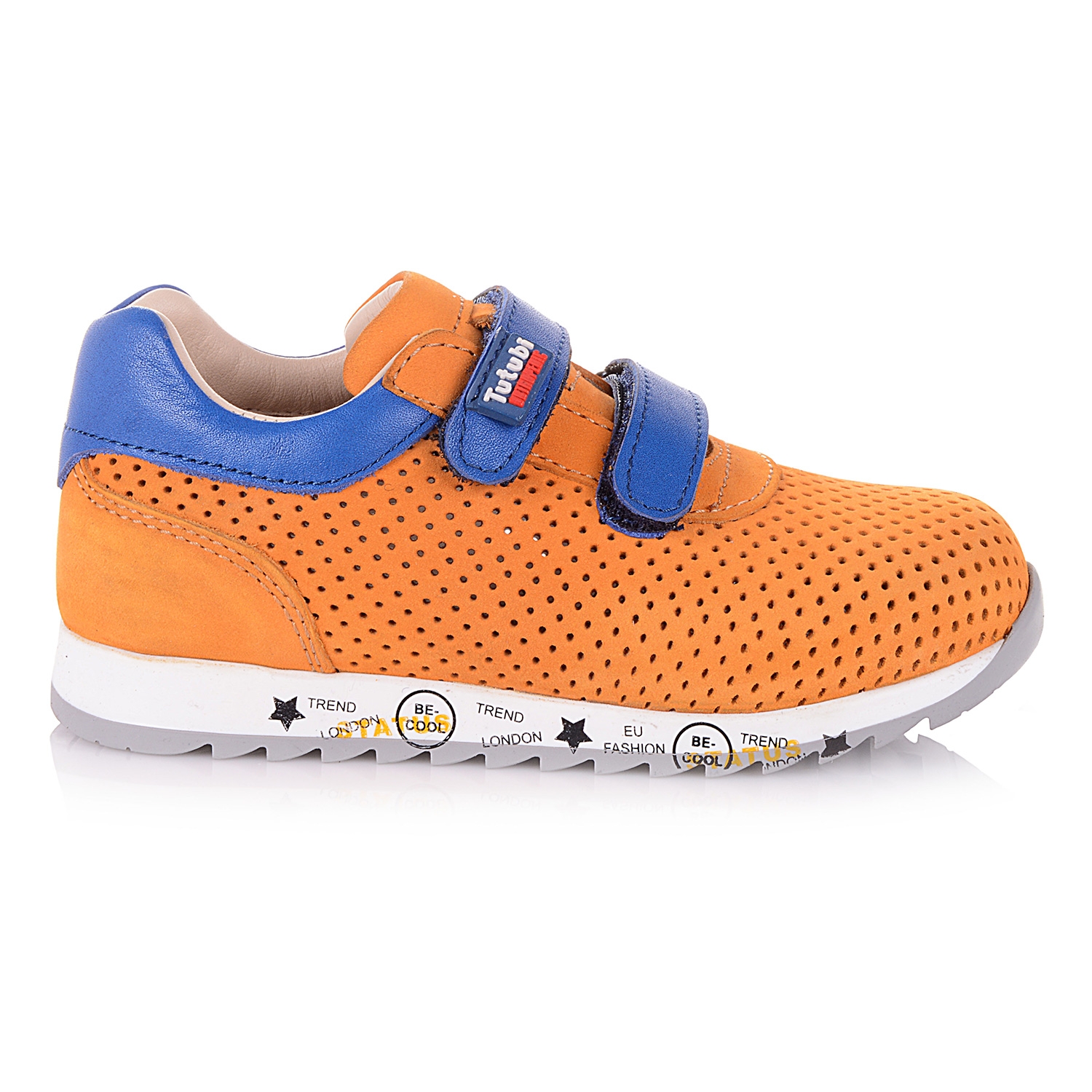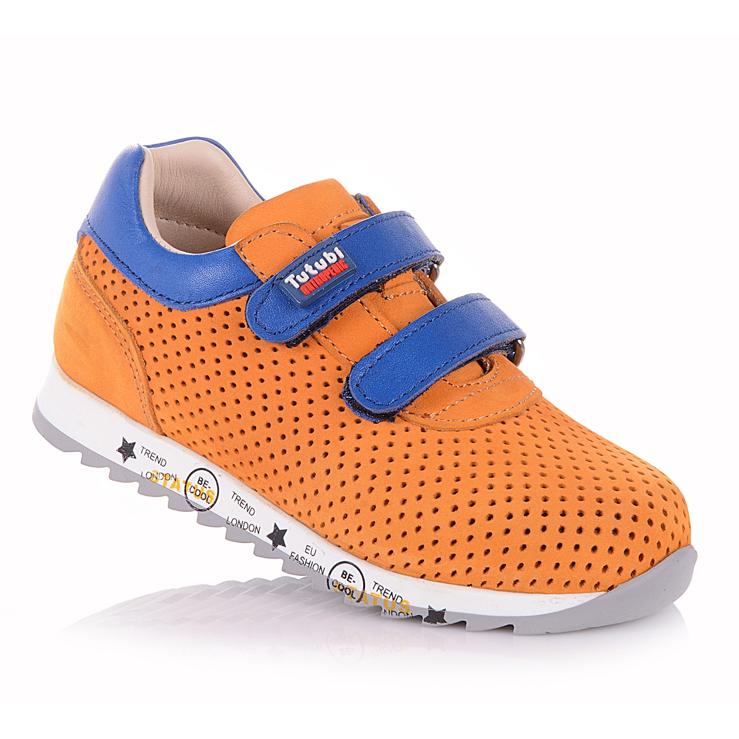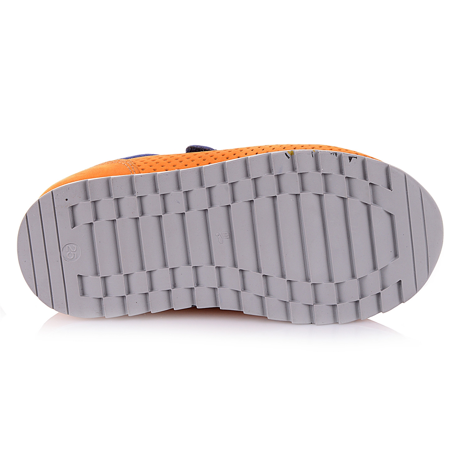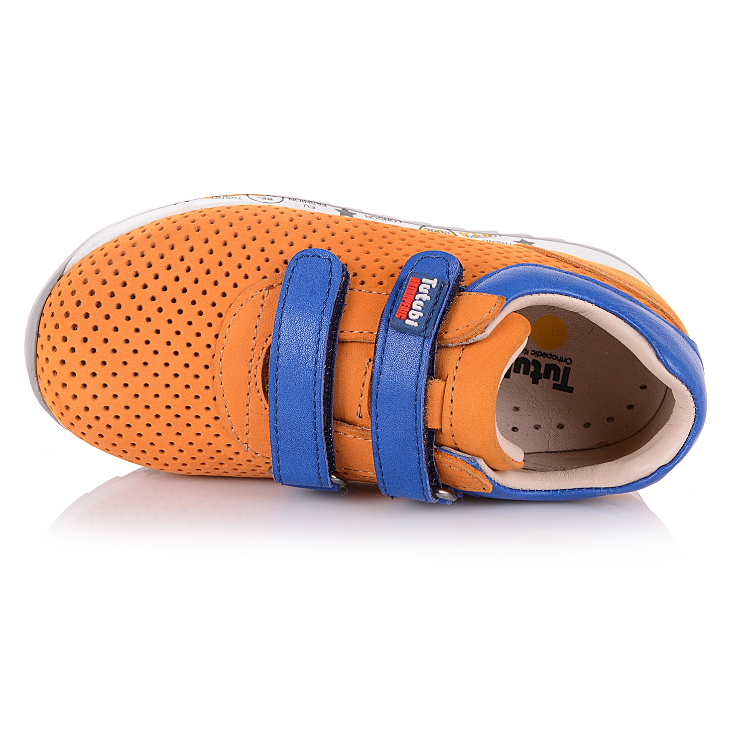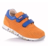 Эффектные ортопедические кроссовки выполнены из натурального нубука оранжевого цвета с синими вставками и перфорацией. Обувь очень красиво и аккуратно смотрится на ножке. Нога любого обьема отлично фиксируется двумя липучками. Анатомическая стелька с твердым супинатором и мягкой прослойкой в пяточной части, поддержит свод стопы и поспособствует здоровому развитию мышц. О фиксации щиколотки позаботится жесткий задник. Подошва, ребристая износостойкая из термокаучука- мягкая, при ходьбе амортизирует. Не отказывайте своему сокровищу в удовольствии носить правильную ортопедическую обувь класса премиум+.