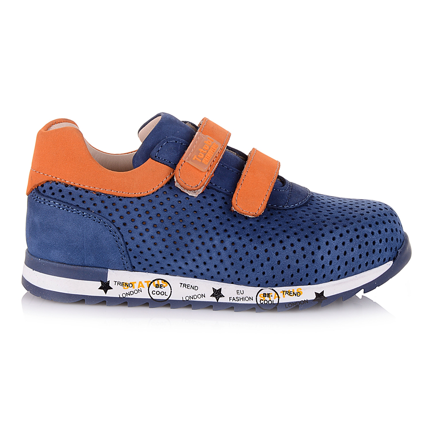 Эффектные ортопедические кроссовки выполнены из натурального нубука синего цвета с оранжевыми вставками и перфорацией. Обувь очень красиво и аккуратно смотрится на ножке. Нога любого обьема отлично фиксируется двумя липучками. Анатомическая стелька с твердым супинатором и мягкой прослойкой в пяточной части, поддержит свод стопы и поспособствует здоровому развитию мышц. О фиксации щиколотки позаботится жесткий задник. Подошва, ребристая износостойкая из термокаучука- мягкая, при ходьбе амортизирует. Не отказывайте своему сокровищу в удовольствии носить правильную ортопедическую обувь класса премиум+.