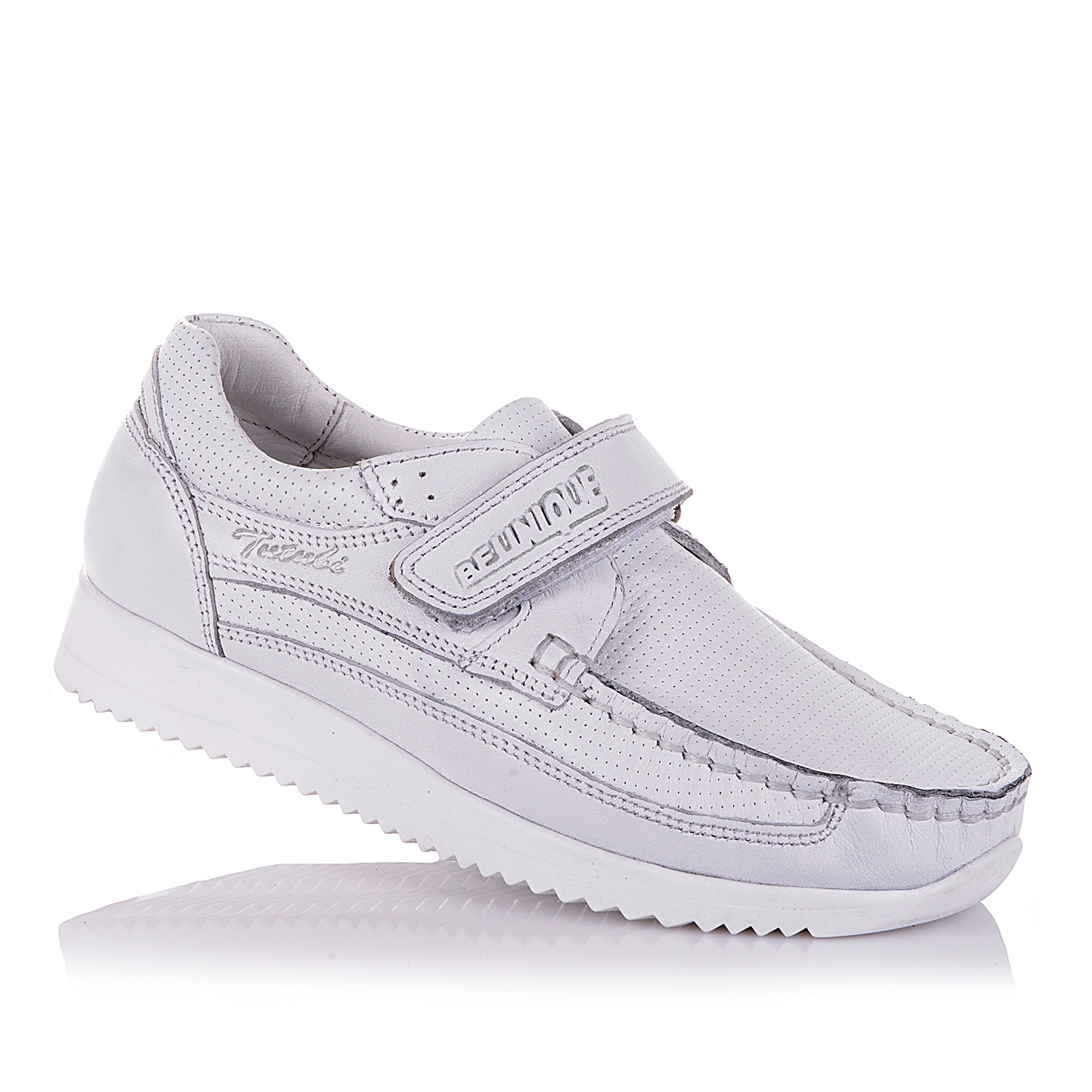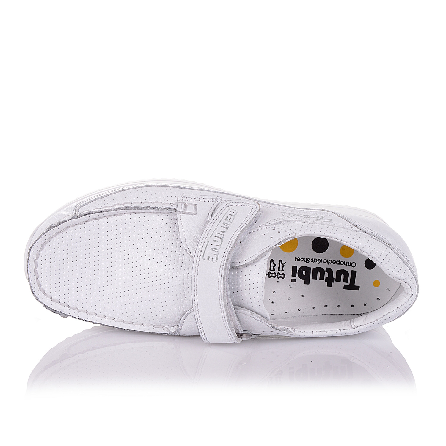 Очень мягкие и удобные мокасины белого цвета из натуральной кожи, смотрятся очень достойно и дорого. Нога отлично фиксируется липучкой. Внутренняя кожаная стелька с супинатором, мягкой прослойкой в пяточной части поддержит свод стопы и поспособствует здоровому развитию мышц, а твердый задник обеспечивают физиологически правильное положение ножки. Анатомическая износостойкая подошва из термокаучука очень мягкая и амортизирует, обеспечивая комфортную походку и хорошее сцепление с твердой поверхностью. Обувь такого качества и дизайна приковывает взгляды!