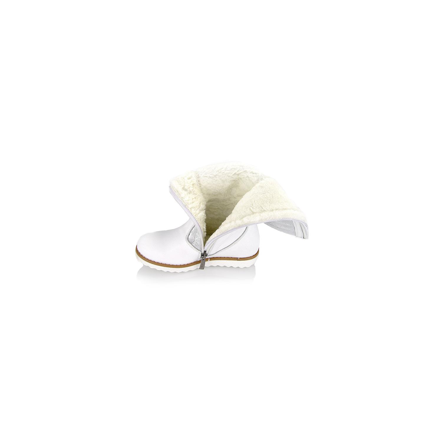 Зимние сапоги белого цвета с серебристыми вставками. Снаружи кожа, внутри мех - натуральная цигейка, твердая пятка. Высота сапога 26 - 29,5см в зависимости от размера (без учета подошвы).