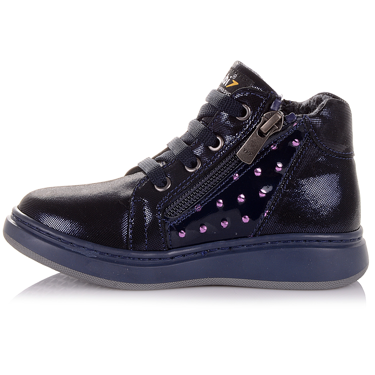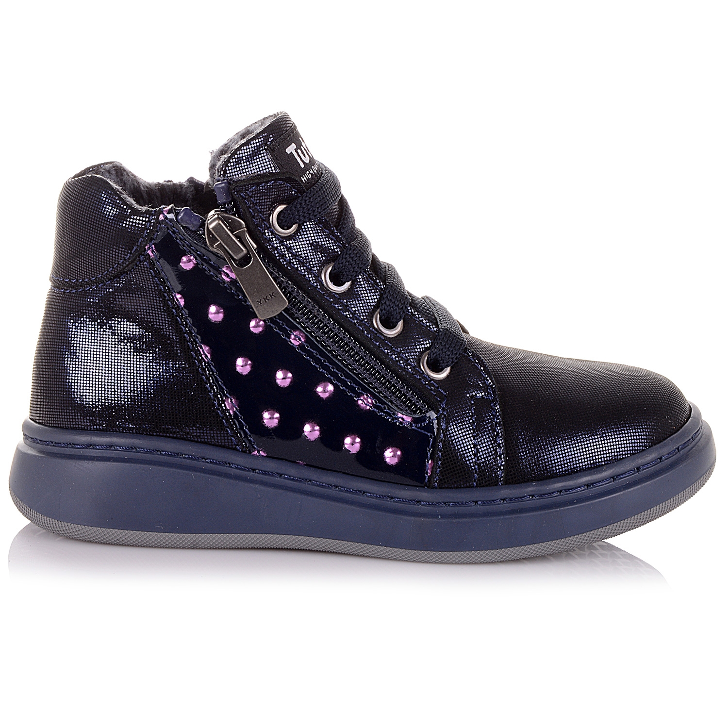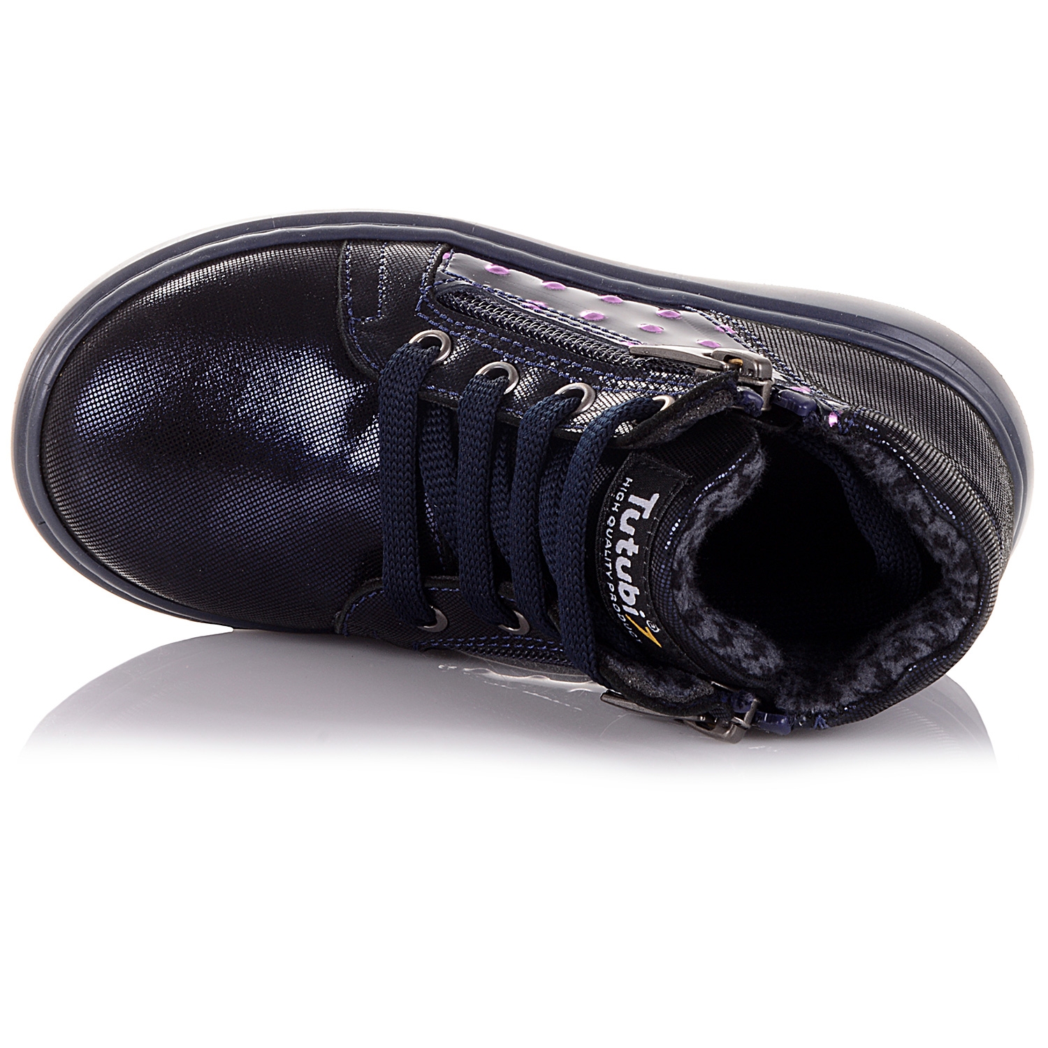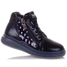 Демісезонні черевики з нубуку – зручне та практичне взуття для дівчаток. Черевики виконані в темно-синьому кольорі, переливаються на світлі та ефектно виглядають. На боковій частині виробу розташовані вставки з лакової шкіри. Внутрішня частина виробу та устілка зроблені з флісу, що зберігає тепло. Підошва з термоеластопласту перешкоджає ковзанню і захищає стопу від пошкоджень. Жорсткий задник дозволяє зафіксувати п'яту і голеностоп, а також запобігти розтягуванням. Взуття легко і надійно фіксується на нозі за допомогою шнурків. З боків кожного черевика знаходяться блискавки.