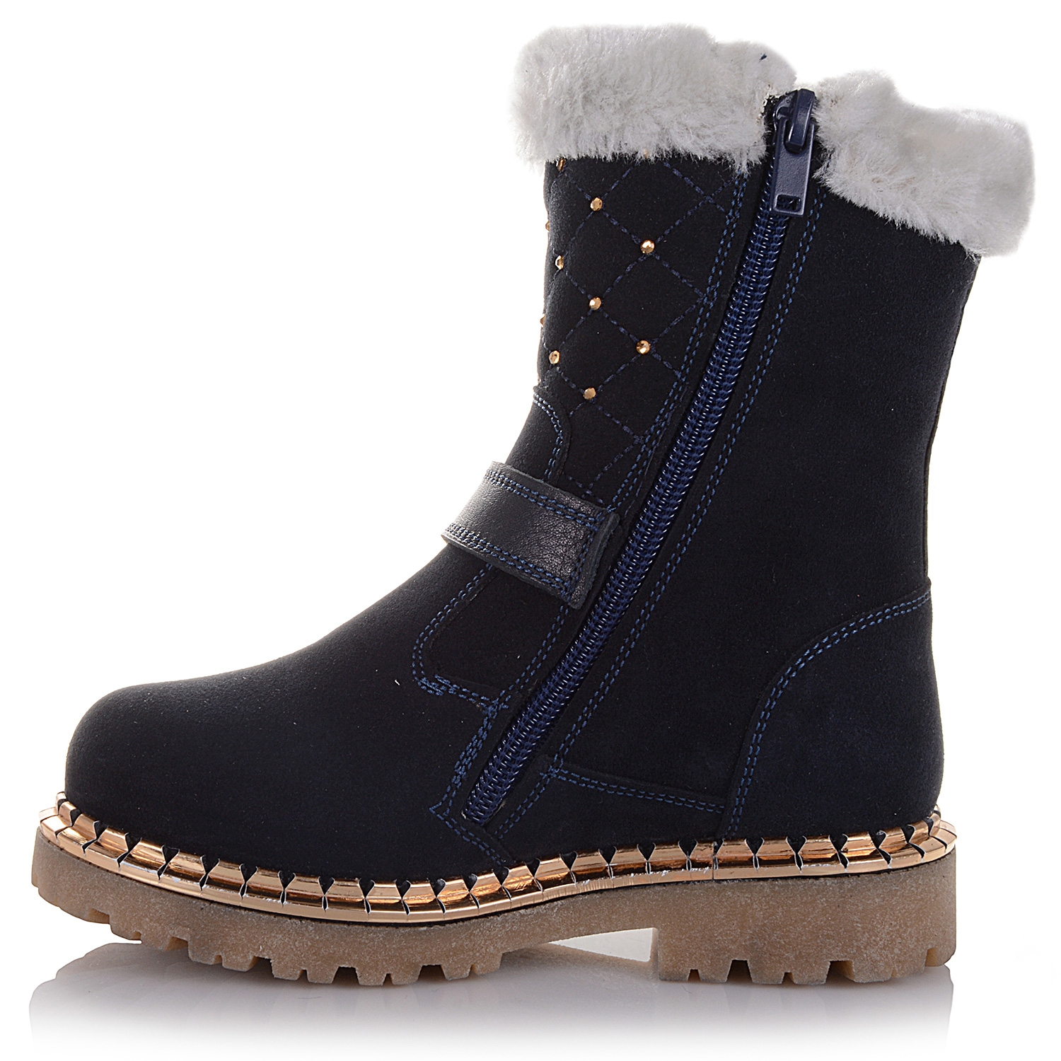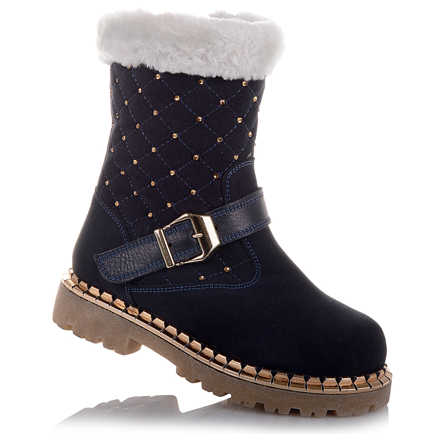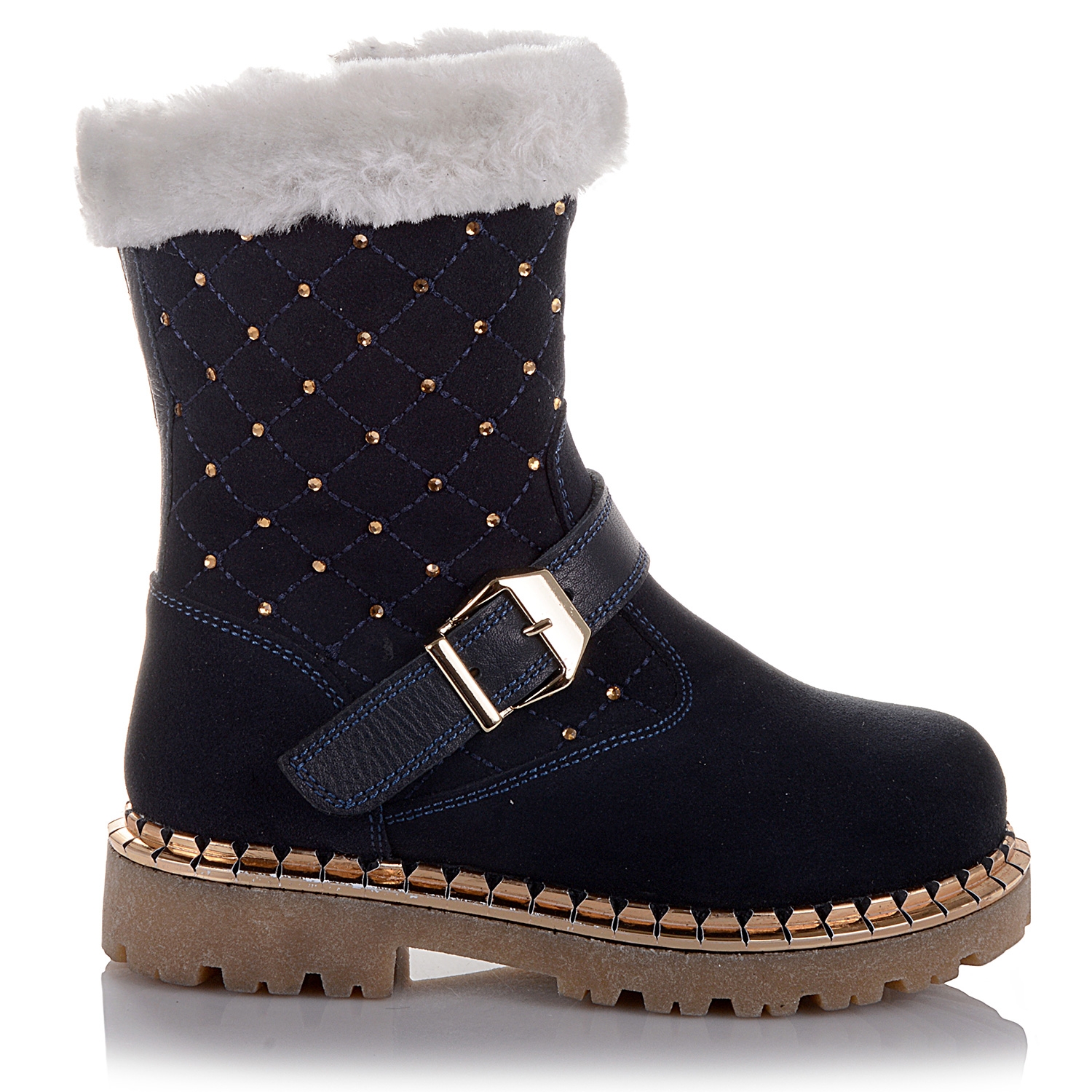 Нарядні зимові чоботи – гарне, тепле та зручне взуття для дівчинки. Зовнішня частина моделі виготовлена із замші, внутрішня – з натурального хутра. Модель представлена в темно-синьому кольорі, який ефектно контрастує з білою хутряною обробкою. Ромбовидна прошивка доповнена яскравими стразами. Металева облямівка золотистого кольору в області підошви – модний тренд цього сезону. Ремінець із золотистою пряжкою служить додатковим способом фіксації і декору. Натуральне хутро усередині черевика забезпечує тепло, комфорт та сухість. Тракторна підошва з термоеластопласту з невеликим каблучком перешкоджає ковзанню, захищає стопу від пошкоджень, не обтяжує крок. Взуття легко та швидко фіксується на нозі за допомогою бокової блискавки.