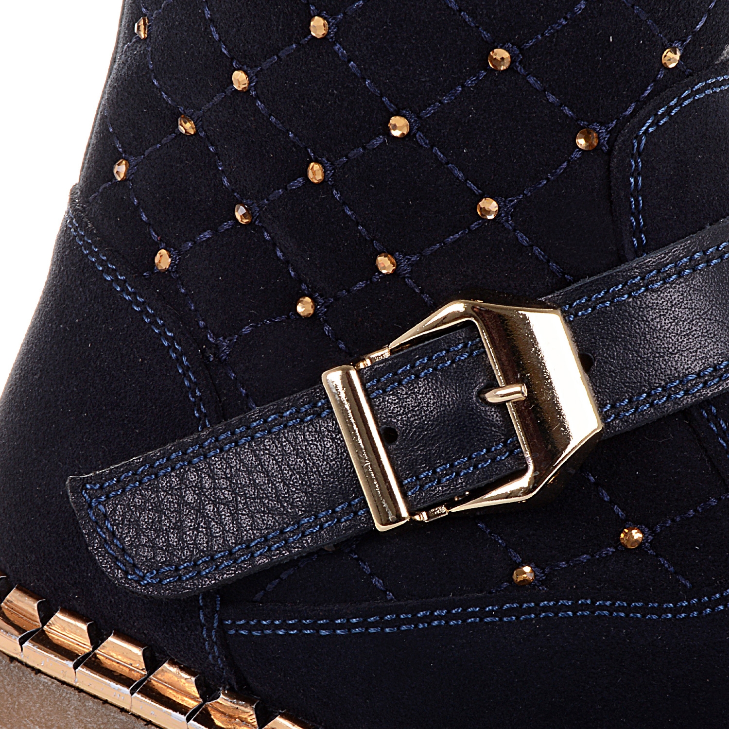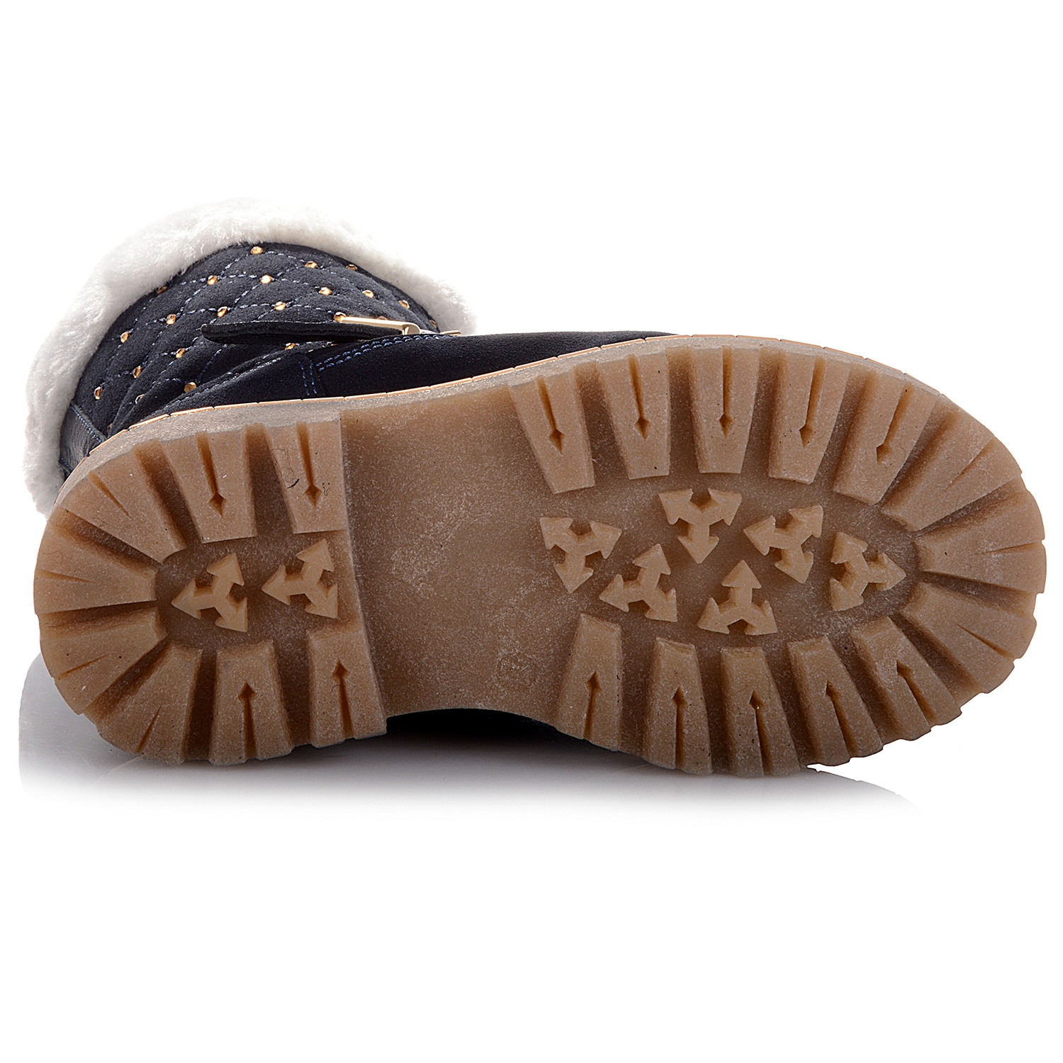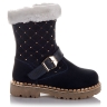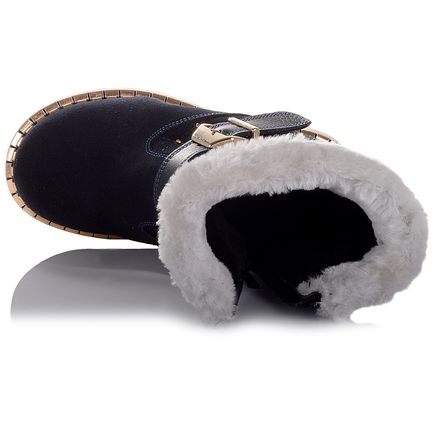 Нарядні зимові чоботи – гарне, тепле та зручне взуття для дівчинки. Зовнішня частина моделі виготовлена із замші, внутрішня – з натурального хутра. Модель представлена в темно-синьому кольорі, який ефектно контрастує з білою хутряною обробкою. Ромбовидна прошивка доповнена яскравими стразами. Металева облямівка золотистого кольору в області підошви – модний тренд цього сезону. Ремінець із золотистою пряжкою служить додатковим способом фіксації і декору. Натуральне хутро усередині черевика забезпечує тепло, комфорт та сухість. Тракторна підошва з термоеластопласту з невеликим каблучком перешкоджає ковзанню, захищає стопу від пошкоджень, не обтяжує крок. Взуття легко та швидко фіксується на нозі за допомогою бокової блискавки.