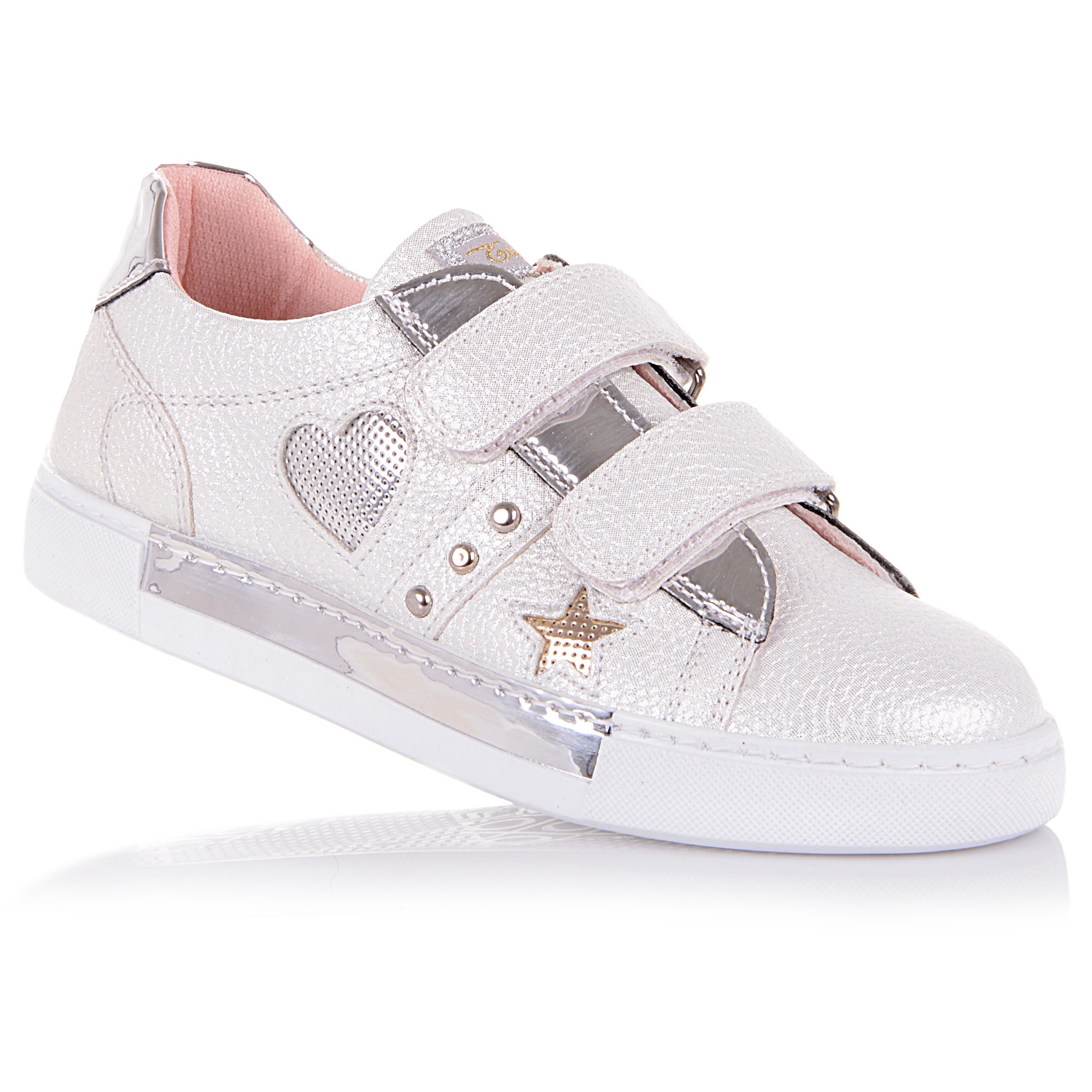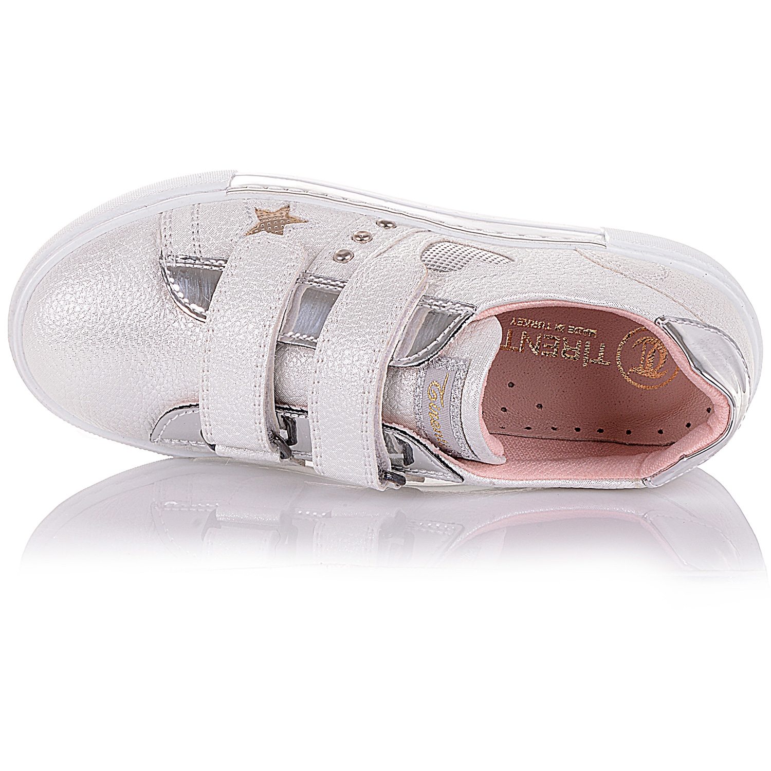 Нові кросівки від Tirenti – це комфортне спортивне взуття з яскравим оформленням. Модель виготовлена з екологічної шкіри (верх) та італійського текстилю (внутрішня частина). Ефектне «перламутрове напилення» в поєднанні з елементами декору привертає увагу і викликає відчуття свята. Біла підошва прикрашена золотистою вставкою. Амортизує крок та стійка до деформації. Внутрішня частина кросівок виготовлена з італійського текстилю. Шкіряна устілка з супінатором і системою відводу вологи підтримує правильне анатомічне положення склепінь стопи та виводить вологу. Липучки дозволяють швидко і надійно закріпити взуття на ніжці.