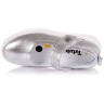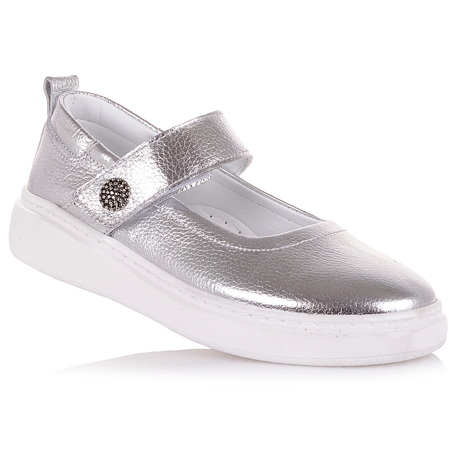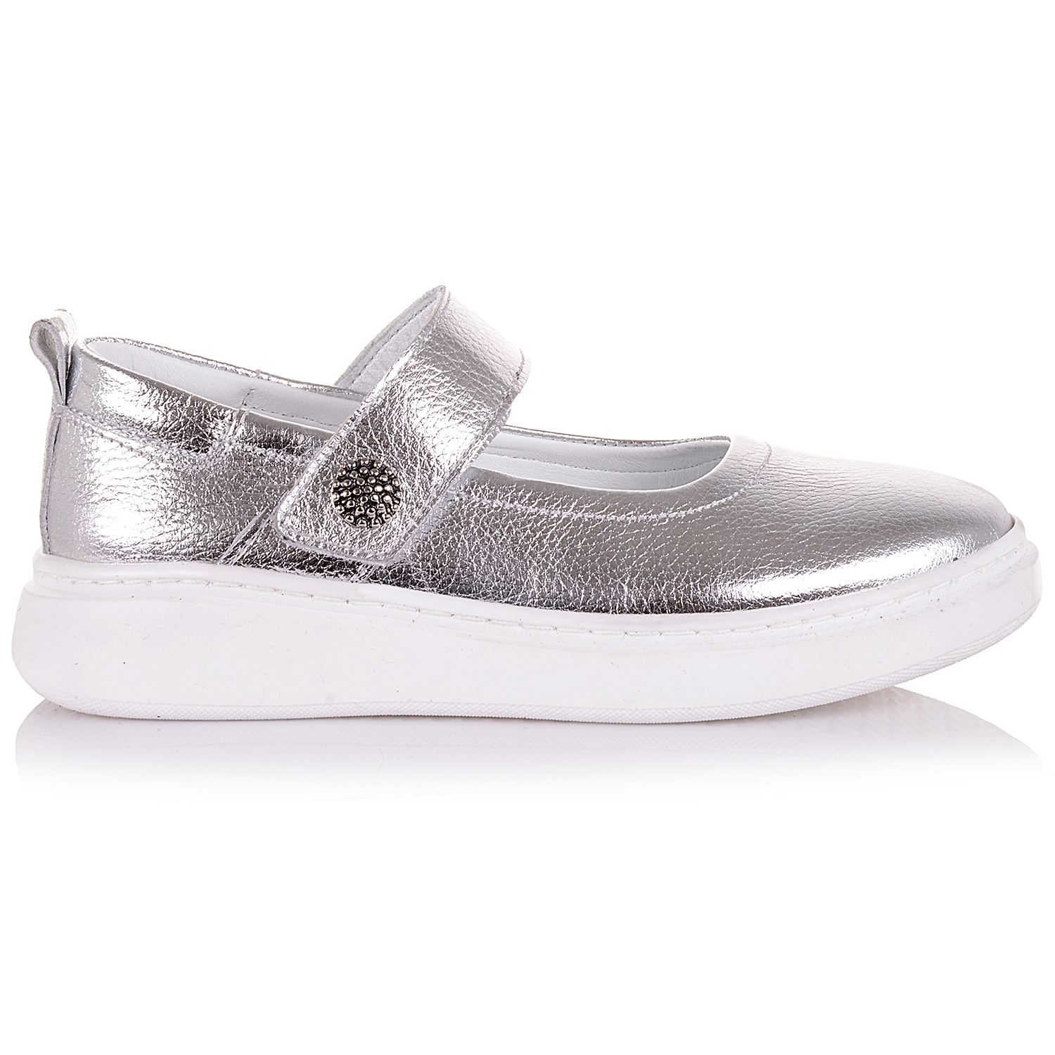 Шкіряні туфлі на білій цільній підошві дозволяють не обирати між повсякденним комфортом та красою дизайну. Простоту силуету взуття компенсує його яскравий сріблястий колір, який як і раніше залишається трендовим у взуттєвій моді. Завдяки округленому носу модель виглядає акуратно та елегантно. Натуральна шкіра приємна на дотик, зносостійка, гігроскопічна: в порівнянні з іншими матеріалами набагато краще поглинає вологу. Для підтримки склепіння стопи в анатомічно правильному і комфортному становищі передбачена шкіряна ортопедична устілка з м'яким супінатором і системою виведення вологи. Ремінець-липучка служить не тільки засобом фіксації, але й стильним елементом дизайну.