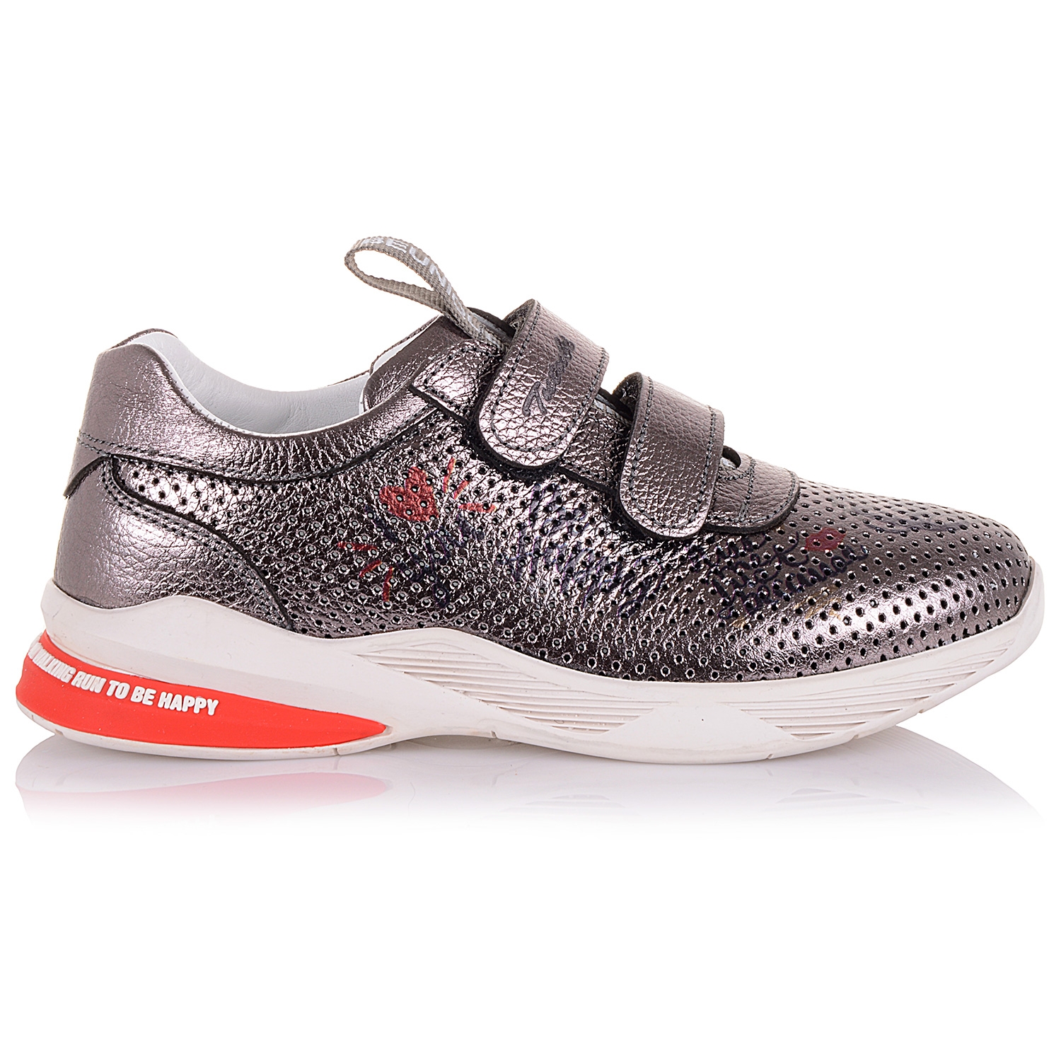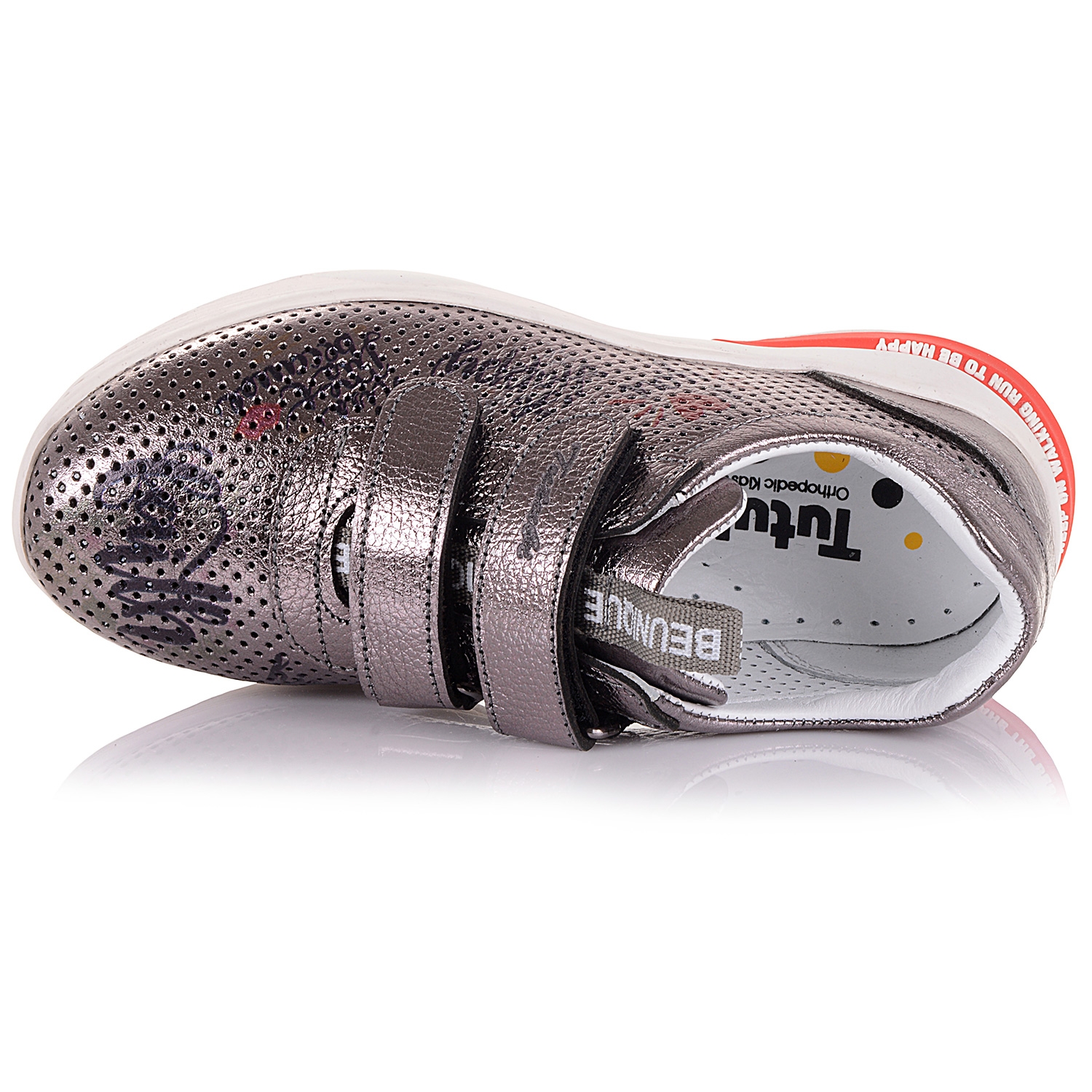 Класичний силует в емоційному оформленні! Tutubi представляє лінійку перфорованих кросівок в стилі диско! Яскравий «бронзовий» колір в поєднанні з виразним принтом у вигляді написів ефектно виглядає, привертає увагу оточуючих. Взуття з натуральної шкіри дозволяє ніжкам «дихати», стійка до зносу, проста в догляді. Перфорований верх підсилює вентиляційні властивості моделі. Подвійна підошва білого кольору перешкоджає ковзанню і амортизує крок. Жорсткий задник забезпечує щільне облягання стопи і утримує її при ривках. Шкіряна устілка з супінатором та спеціальними отворами знижує ударне навантаження на суглоби, контролює відведення вологи під час потовиділення. Кросівки легко зафіксувати на ніжці за допомогою двох липучок.