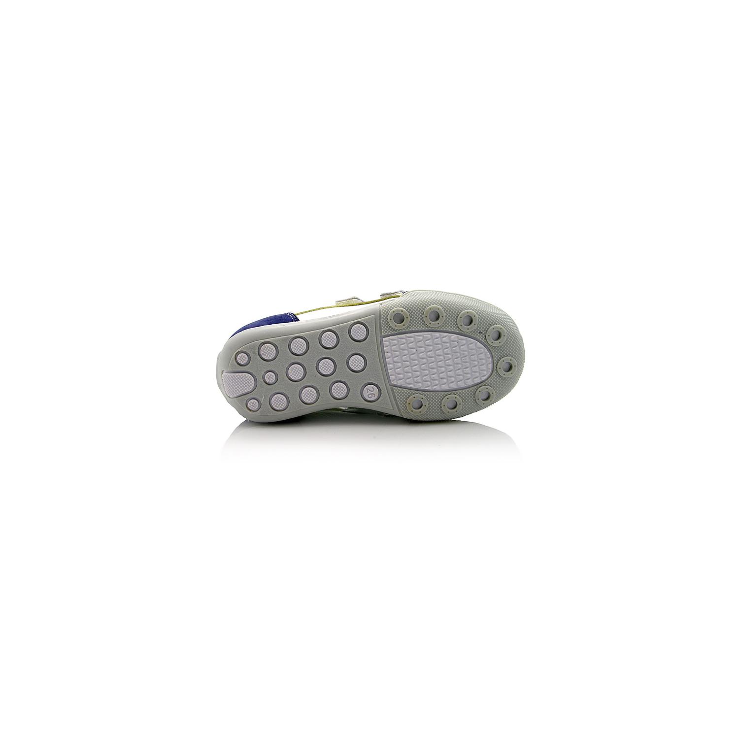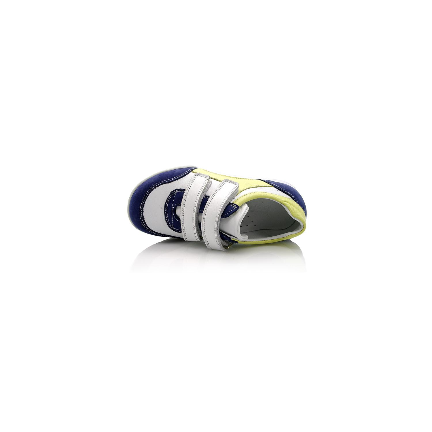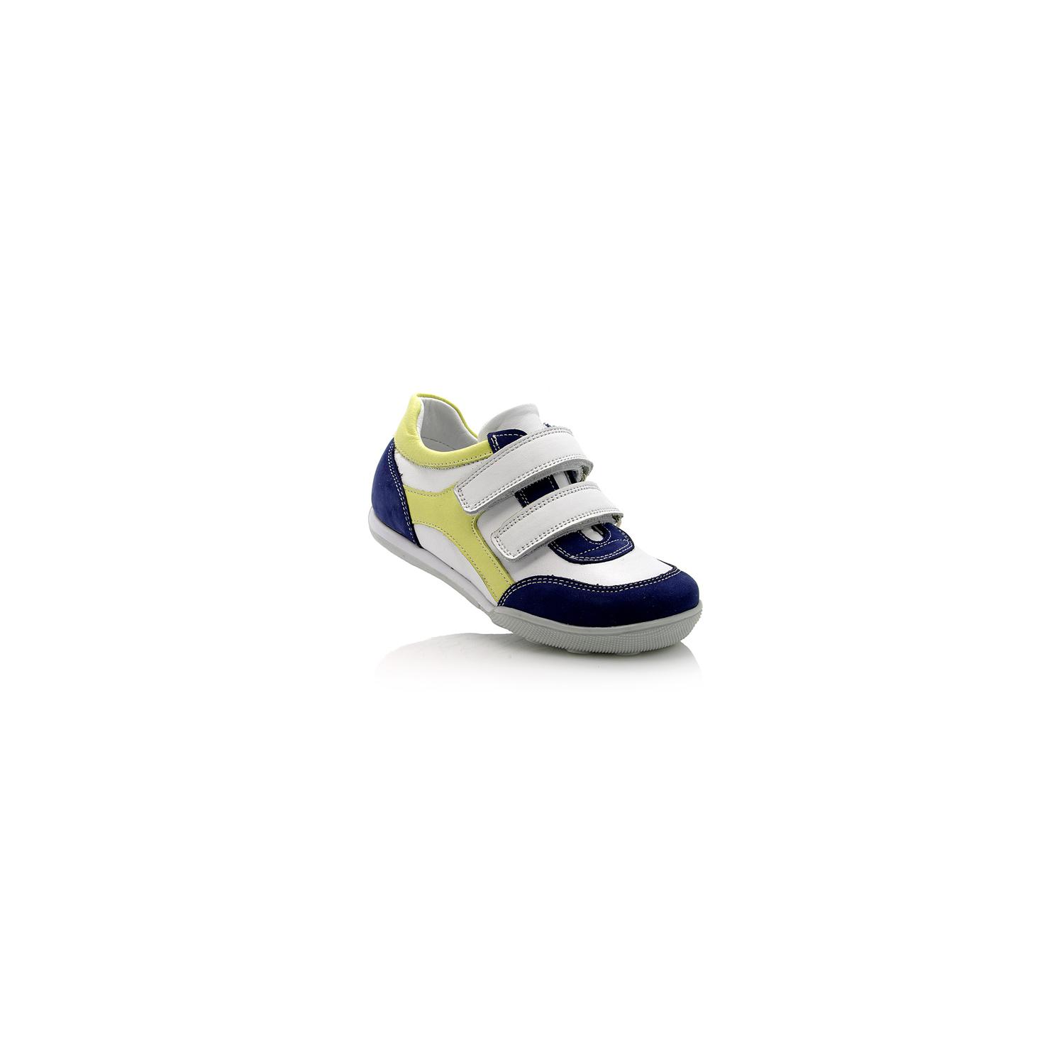 Кроссовки белого цвета с желто-синей вставкой. Сверху регулируются двумя липучками. Снаружи кожа + нубук, внутри - кожаные. Есть твердая пятка и супинатор.