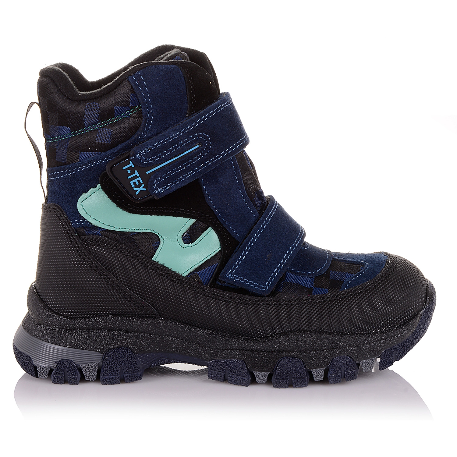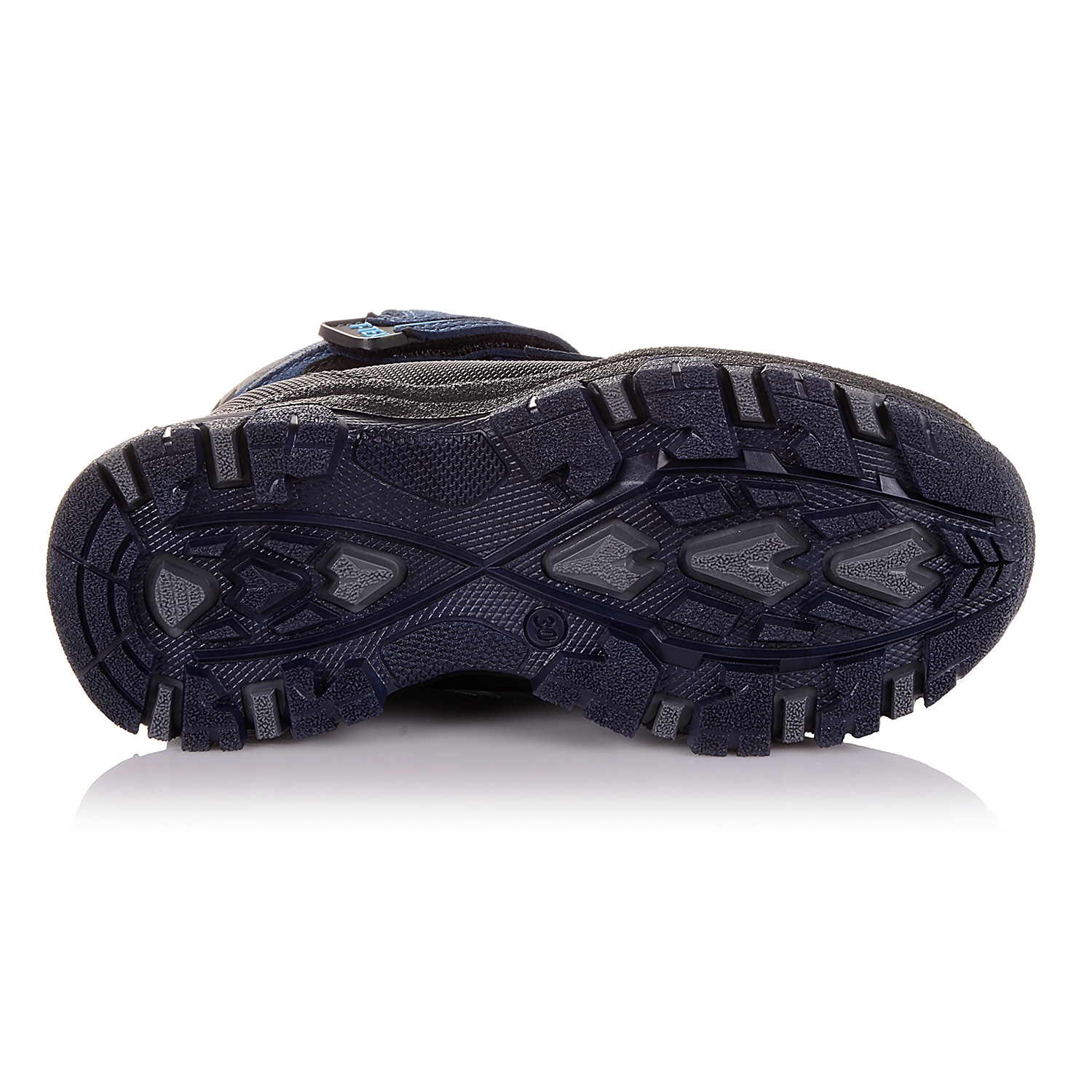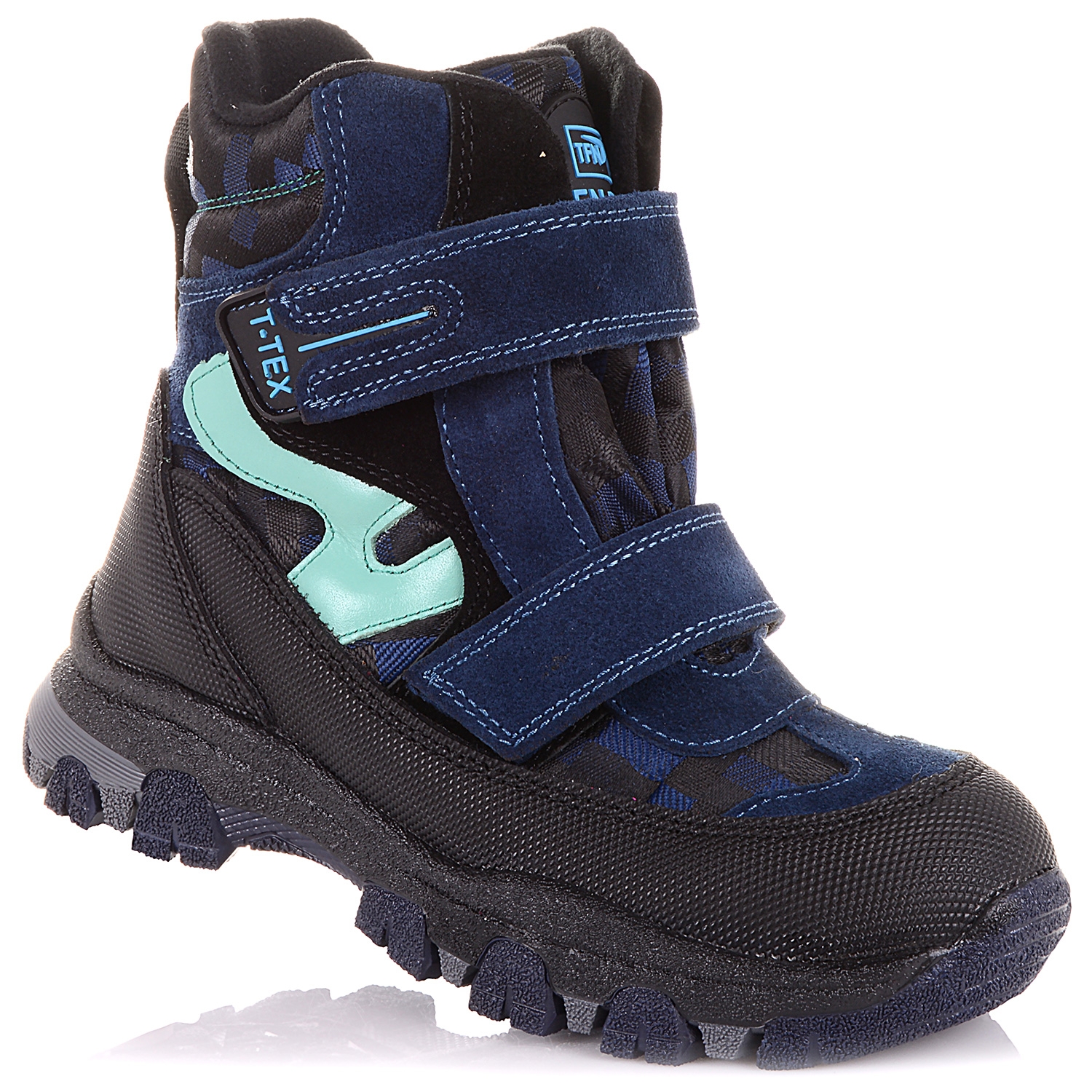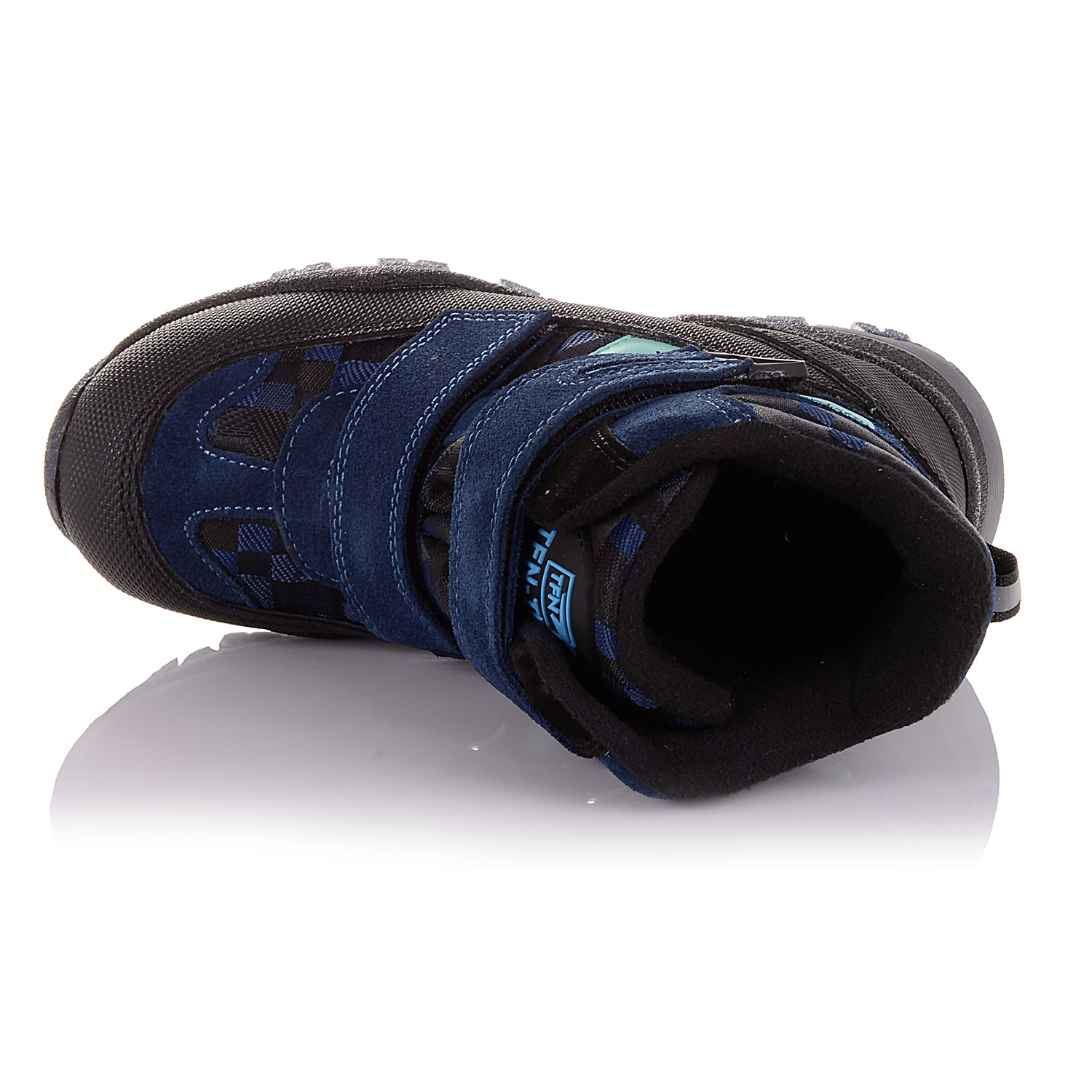 Стильні демісезонні черевики для хлопчика. Зовні черевики виконані з натуральної замші синього кольору та з текстильними вставками. Усередині щільний фліс, устілка виконана з вовни. Високий язичок захищає від потрапляння вологи. Одягати такі черевики - секундна справа, адже там дві зручні липучки. Анатомічна устілка з супінатором підтримує зведення стопи і посприяє здоровому розвитку м'язів. Про фіксації халяви і щиколотки подбає жорсткий задник. Так само модель знизу йде прогумована, що є додатковим захистом. У такому взутті, дитина буде відчувати себе комфортно.