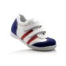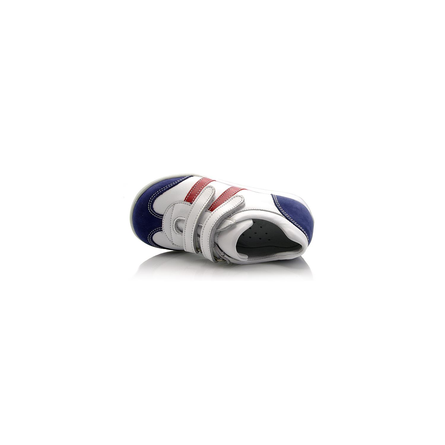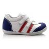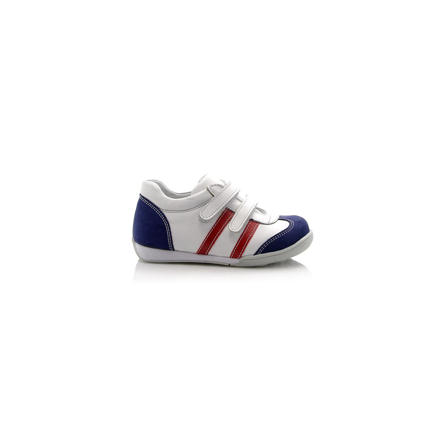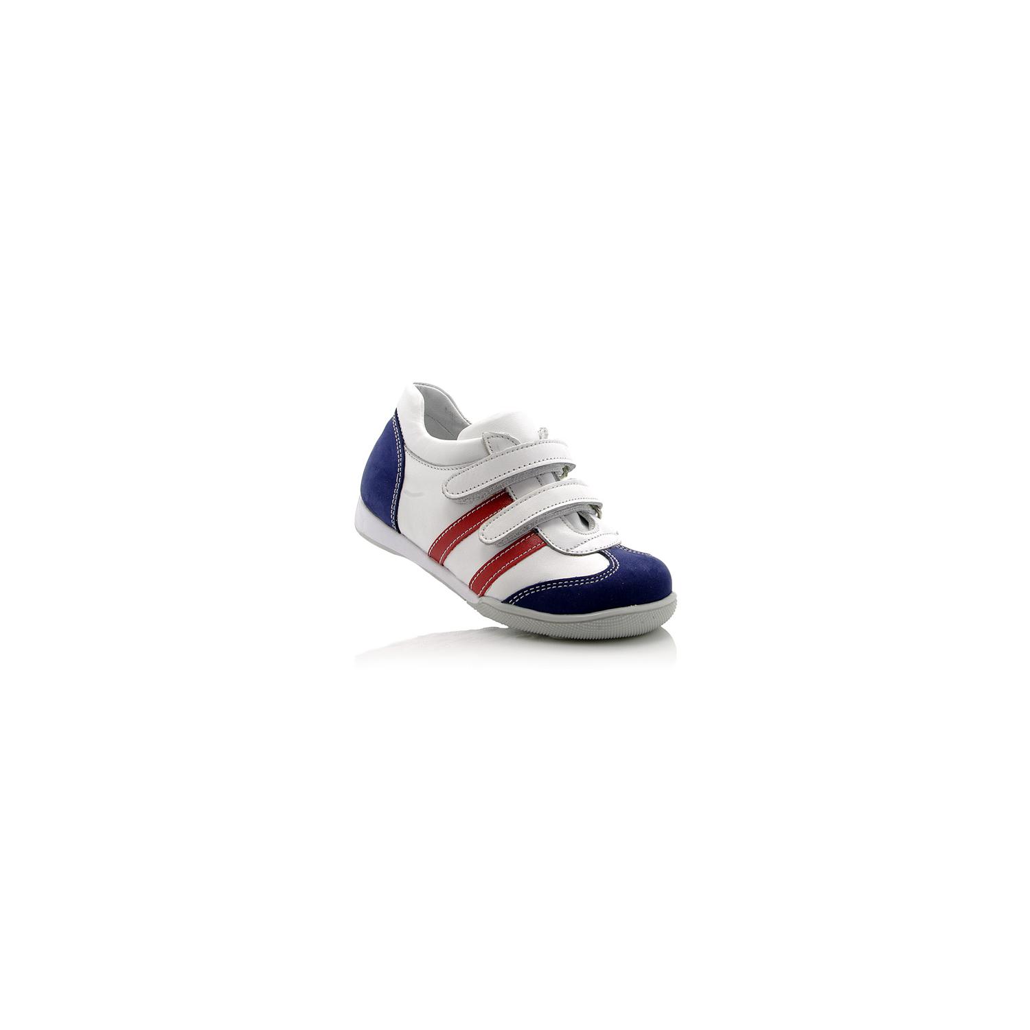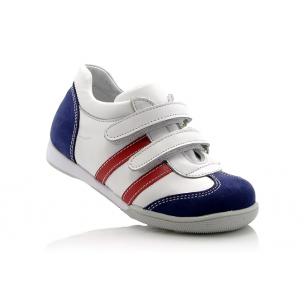 Кроссовки белого цвета с красно-синими вставками. Сверху регулируются двумя липучками. Снаружи кожа + нубук, внутри - кожаные. Есть твердая пятка и супинатор.
