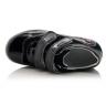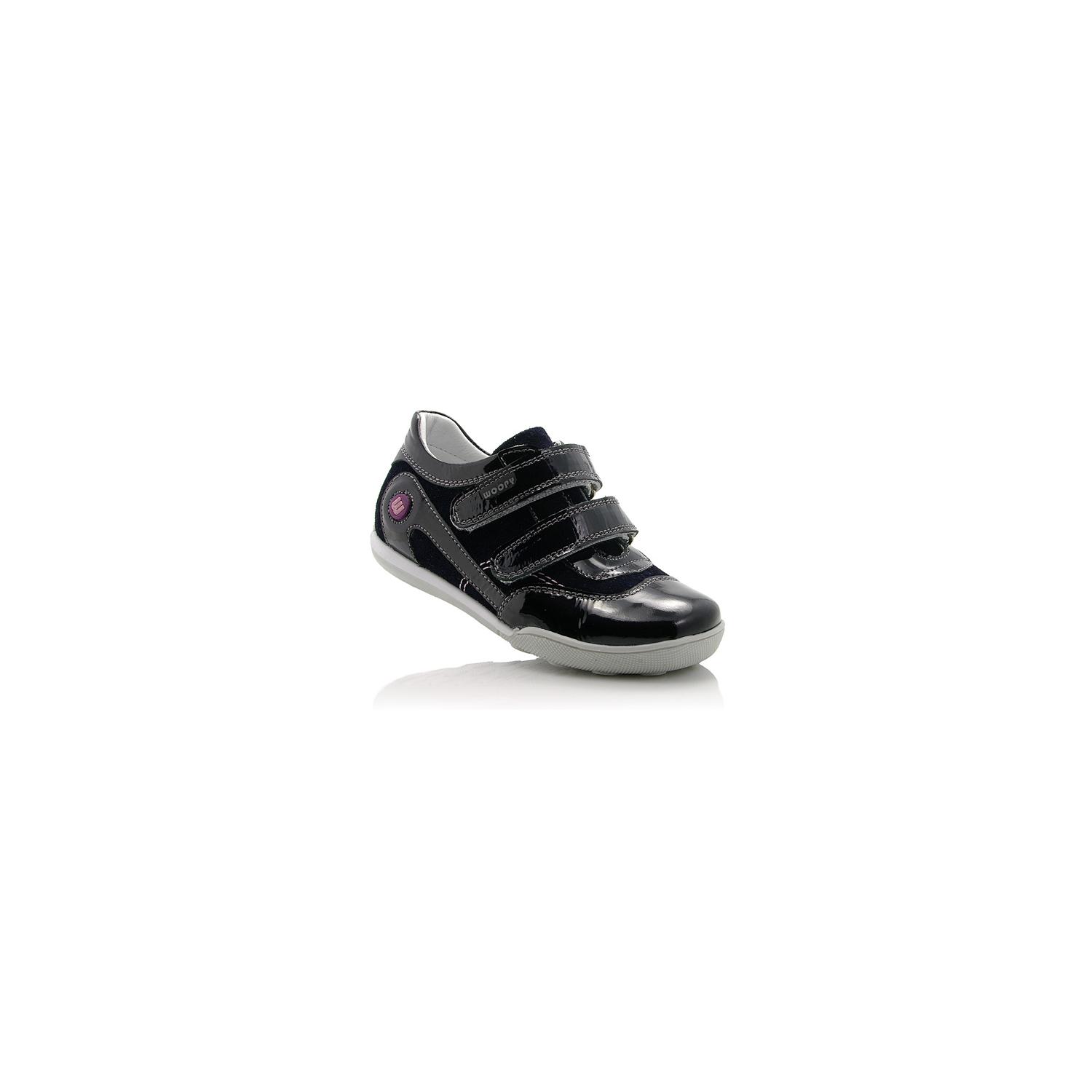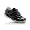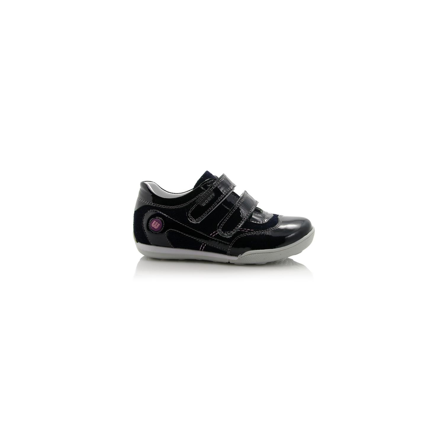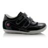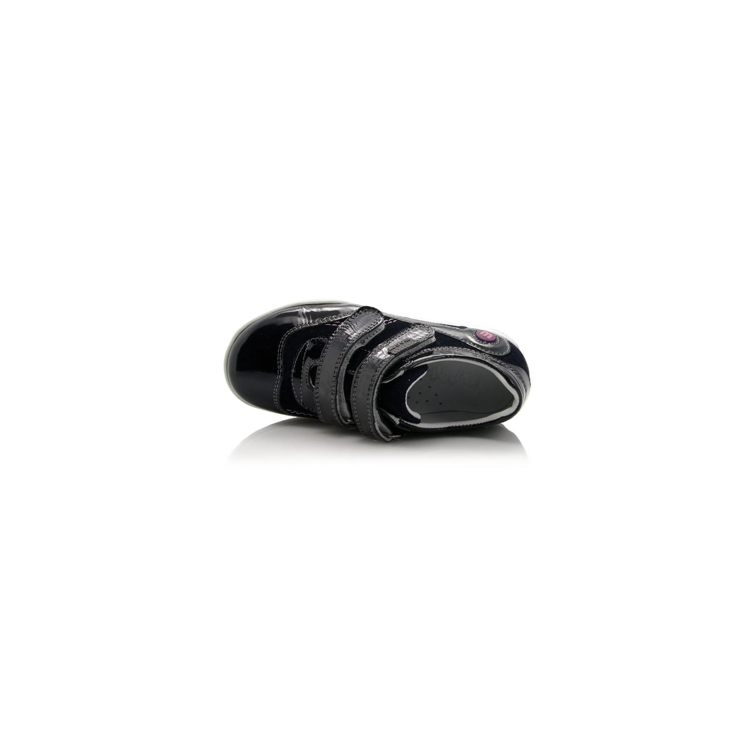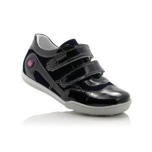 Кроссовки черного цвета лакированные. Сверху регулируются двумя липучками. Снаружи и внутри кожаные. Есть твердая пятка и супинатор.