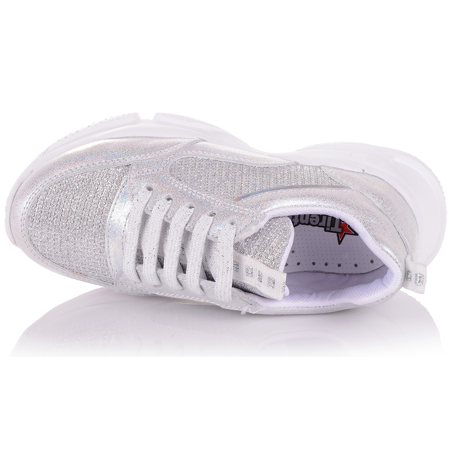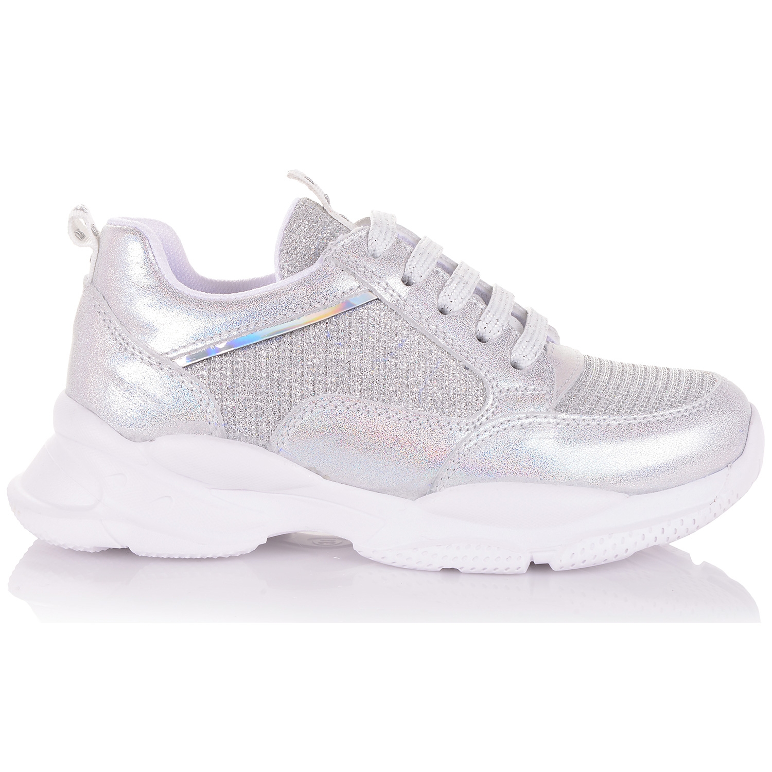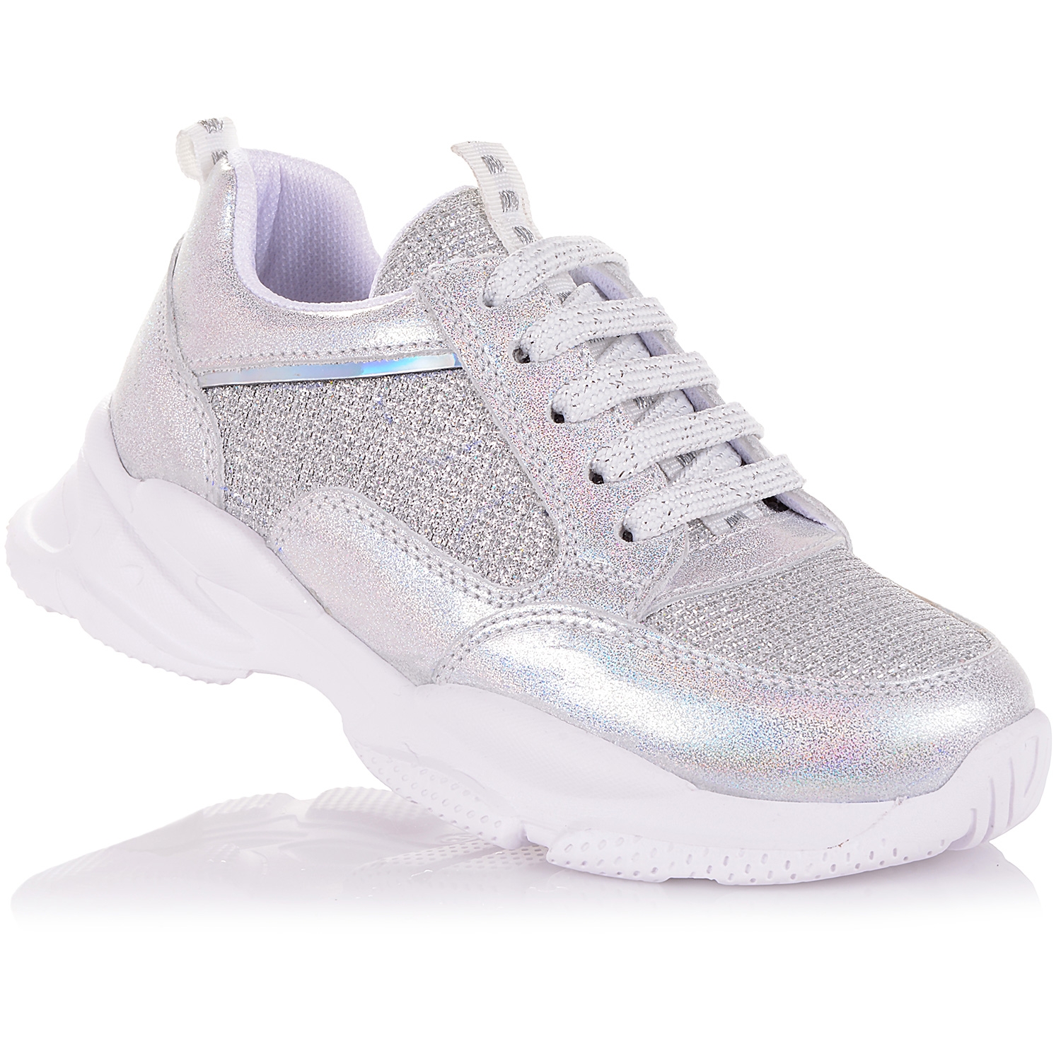 Комфортні та стильні кросівки для дівчинки. Базовий сріблястий колір ефектно контрастує з білою підошвою. Шкіряна устілка з супінатором і системою відводу вологи підтримує правильне анатомічне положення зводу стопи, забезпечує комфорт під час інтенсивних прогулянок. Жорсткий задник попереджає деформування гомілковостопного суглоба і фіксує кістку п'яти в правильному положенні. Масивна підошва не ускладнює крок, захищає стопу від пошкоджень.