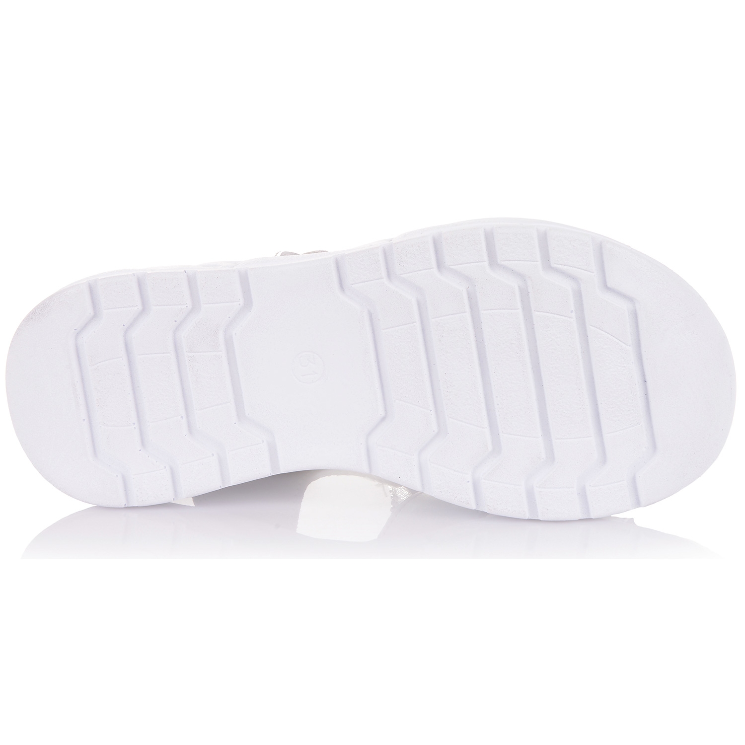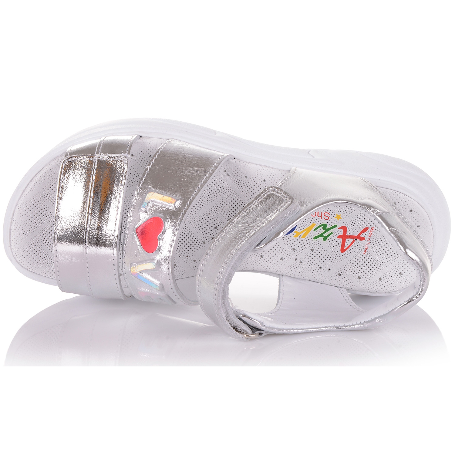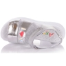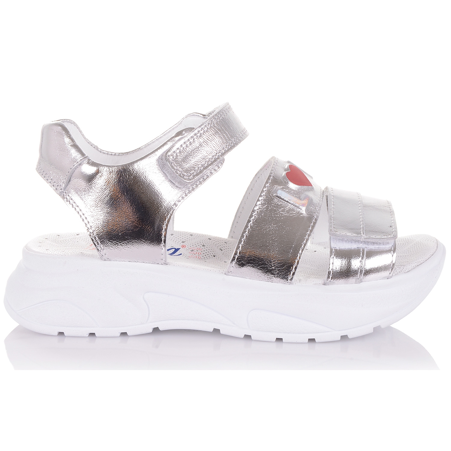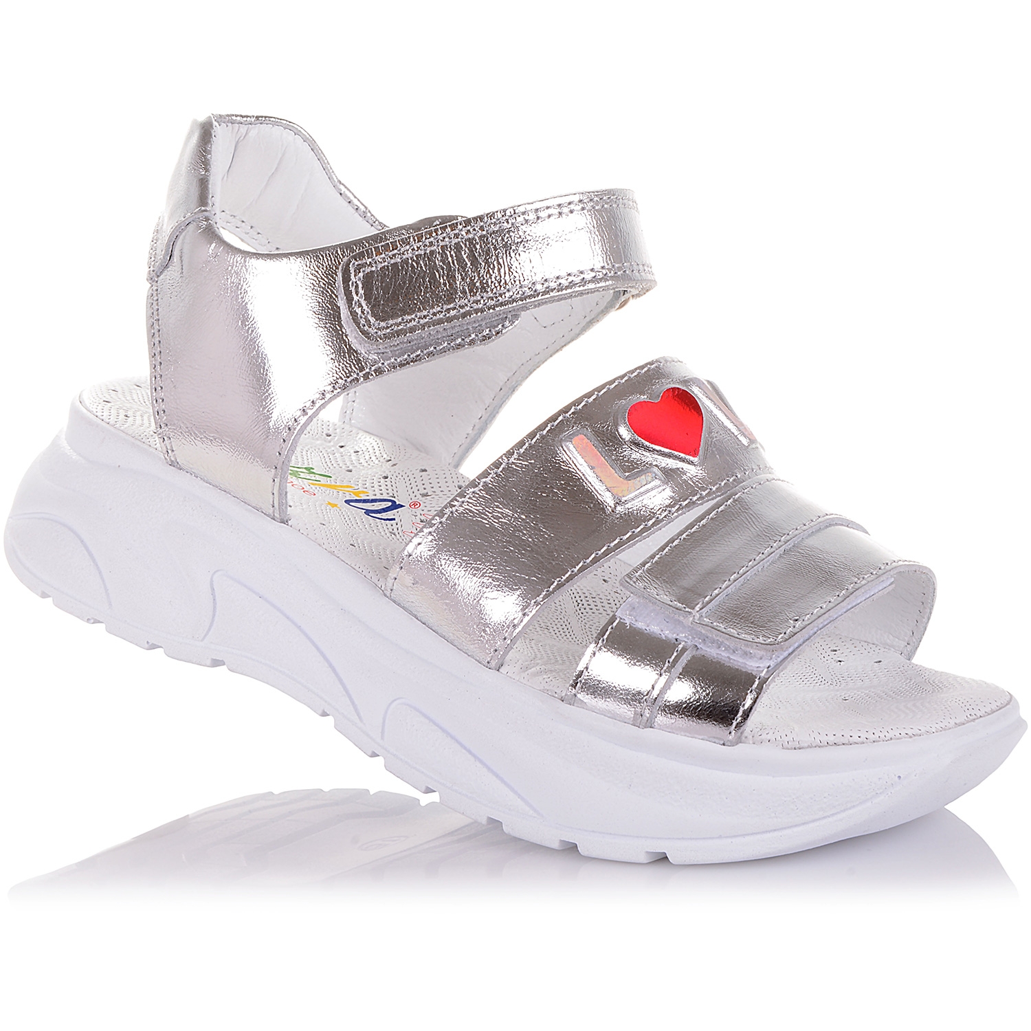 Дитячі босоніжки будуть фантастично виглядати на ногах вашої модниці. Босоніжки виготовлені в лакової шкірі сріблястого кольору, яка ефектно переливається на світлі різними кольорами. Анатомічна устілка з супінатором попереджає розвиток плоскостопості, оскільки нога знаходиться в правильному положенні. Спортивна підошва з термокаучука не ковзає по поверхні, стійка до зносу, амортизує крок і рівномірно розподіляє навантаження по всій стопі під час ходьби. За допомогою липучок взуття міцно фіксується на нозі.