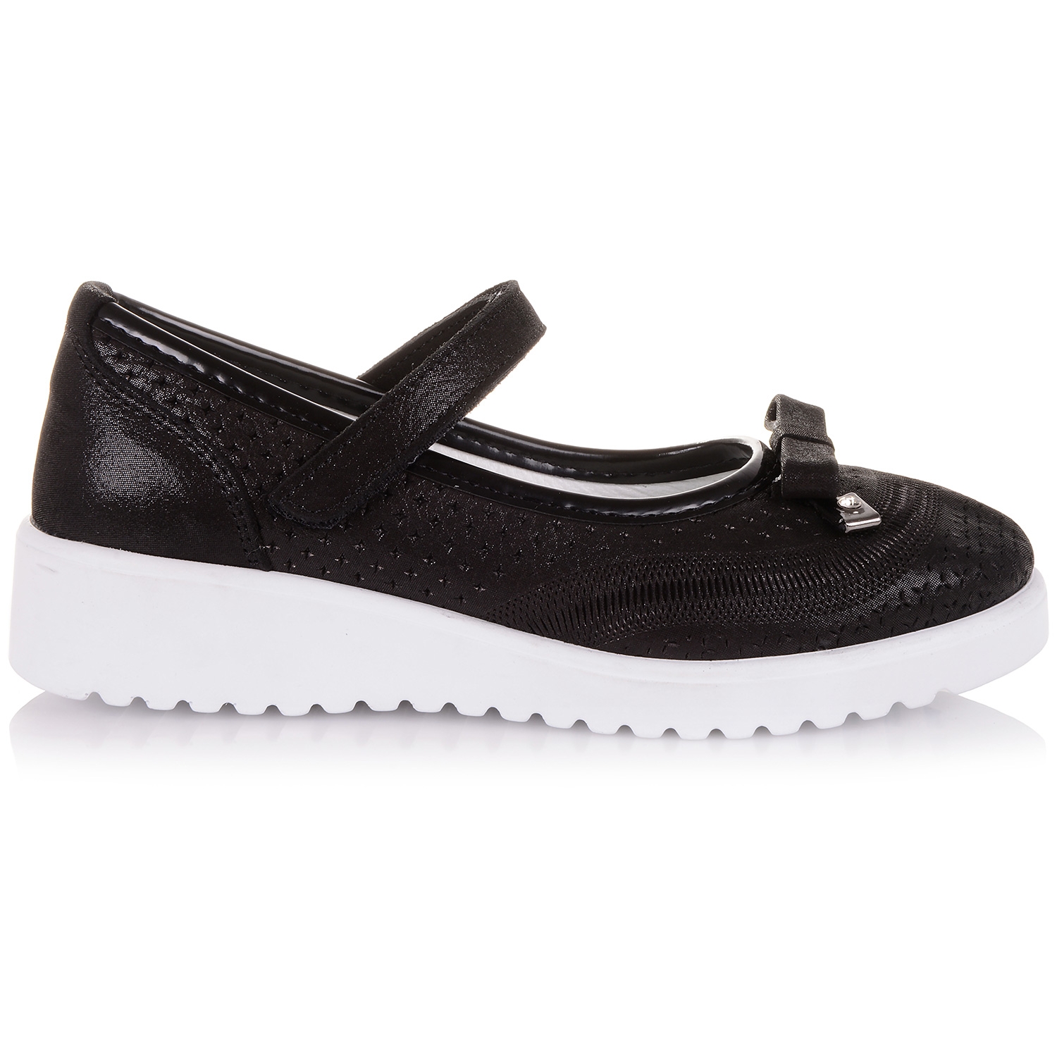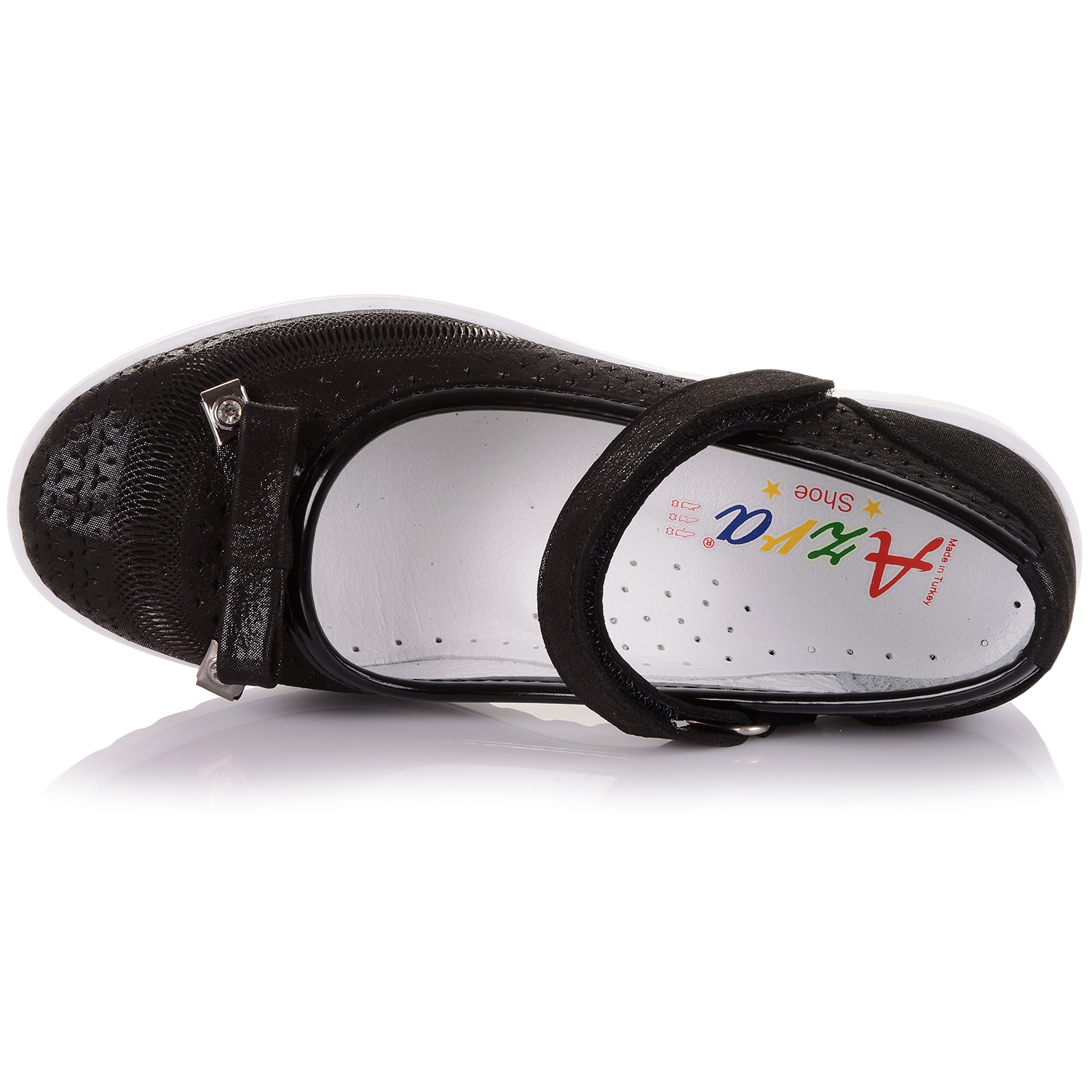 Дитяче взуття виконано в чорному кольорі, виготовлено з екологічно чистих матеріалів - нубуку (верхня частина взуття) і натуральної шкіри (внутрішня частина). Легкість кроку, амортизацію і хороше зчеплення з твердою поверхнею забезпечує ребриста підошва з термоеластопласту. Завдяки шкіряної устілки з супінатором вдається підтримувати зведення стопи і зменшувати навантаження на суглобово-зв'язковий апарат. Жорсткий задник допомагає зафіксувати положення п'яткової кістки. Взуття для дітей надійно фіксується на нозі за допомогою липучки.