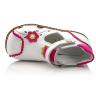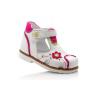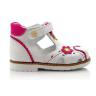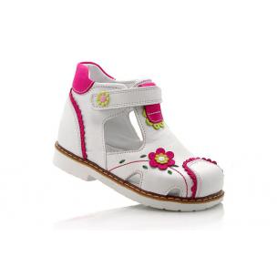 Босоножки ортопедические белого цвета с малиновым цветочком (закрытый носок). Сверху фиксируются липучкой. Снаружи и внутри кожаные. Высокая твердая пятка, супинатор и ортопедический каблук Томаса.