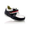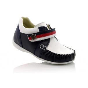 Мокасины темно-синего цвета с белыми вставками. Сверху фиксируются липучкой, снаружи и внутри кожаные. Есть супинатор и твердая пятка.