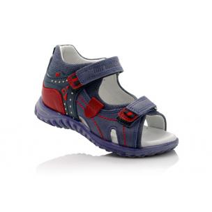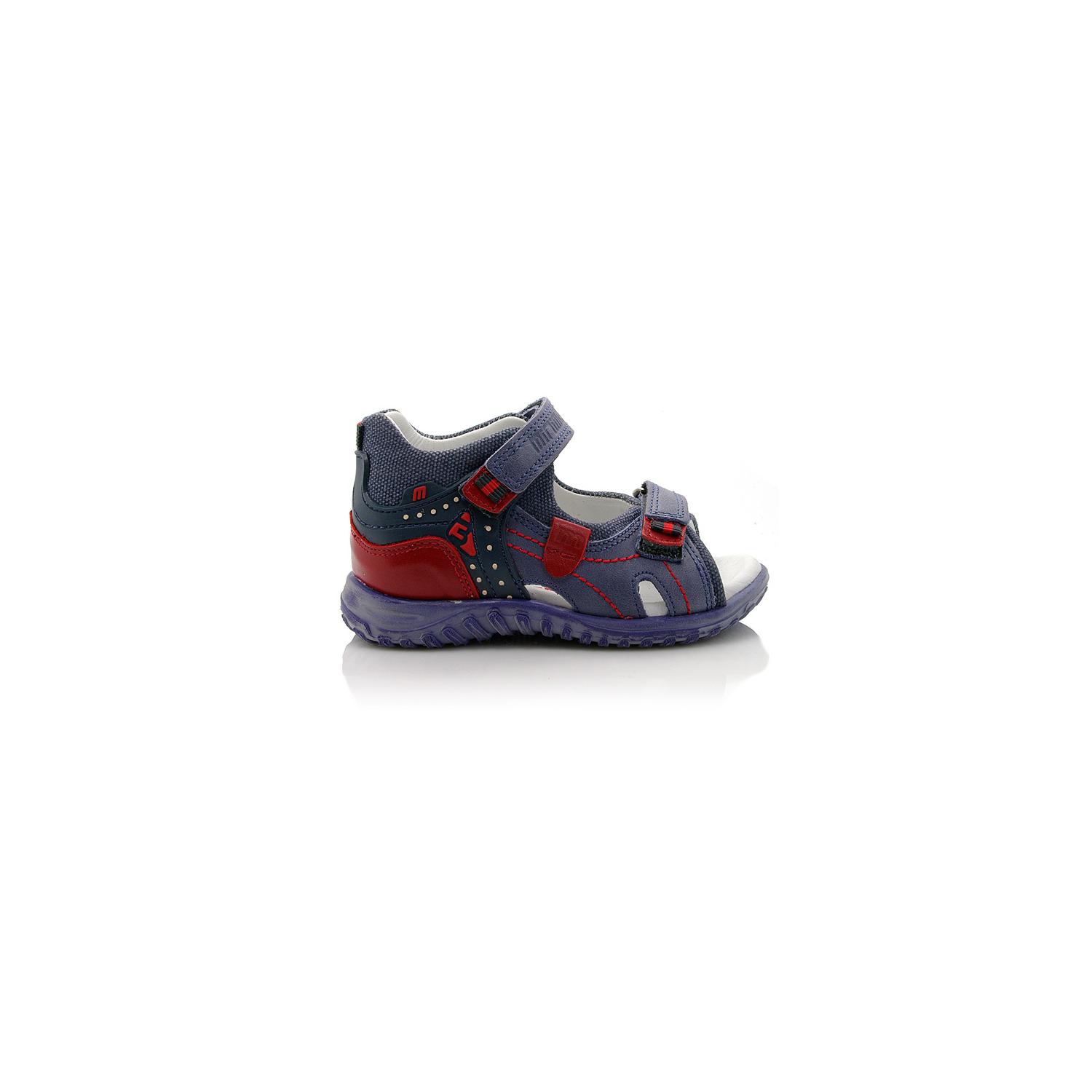 Босоножки Minimen светло-синего цвета с красными вставками, на 2-х липучках. Внутри и снаружи кожаные, есть супинатор и твердая пятка.