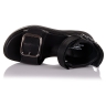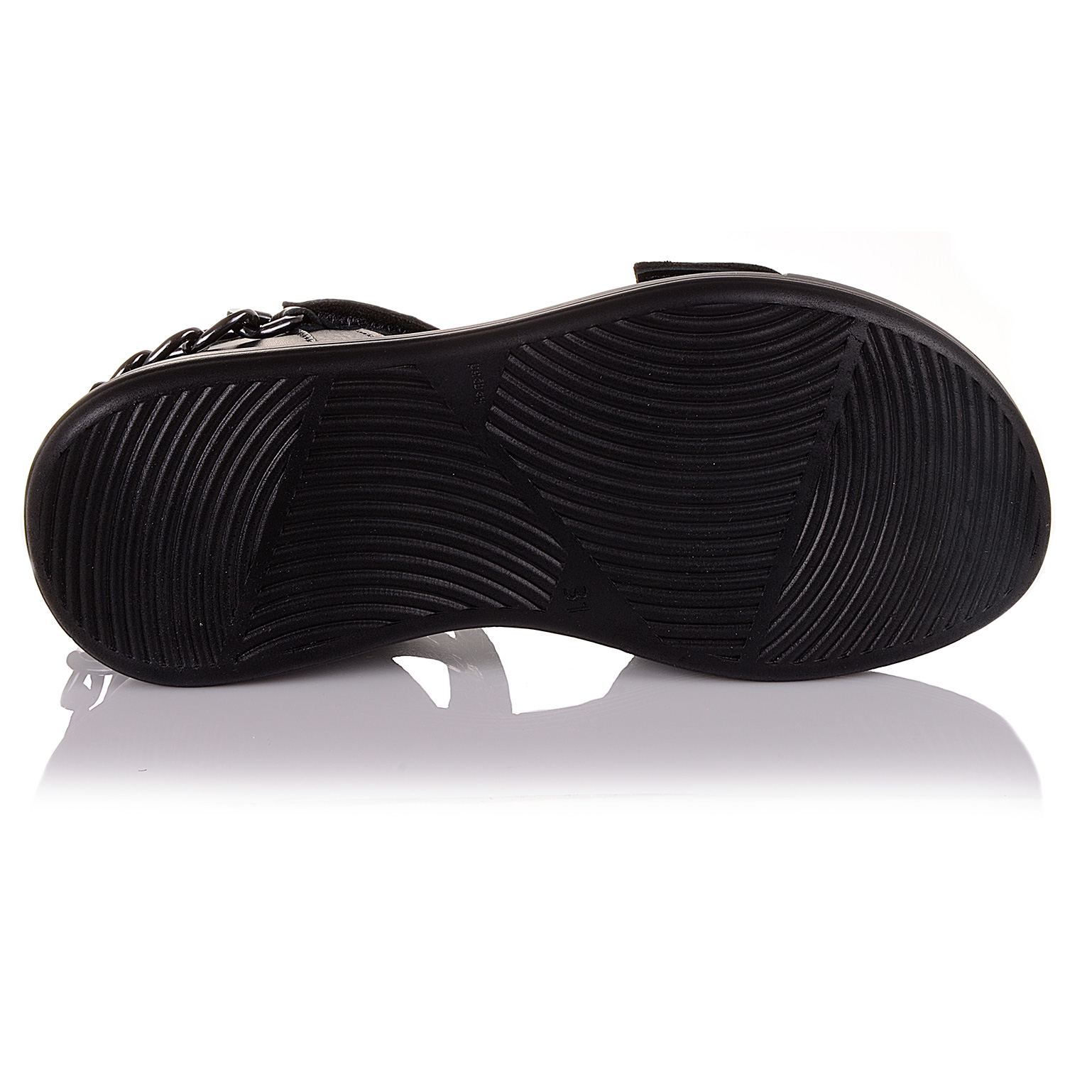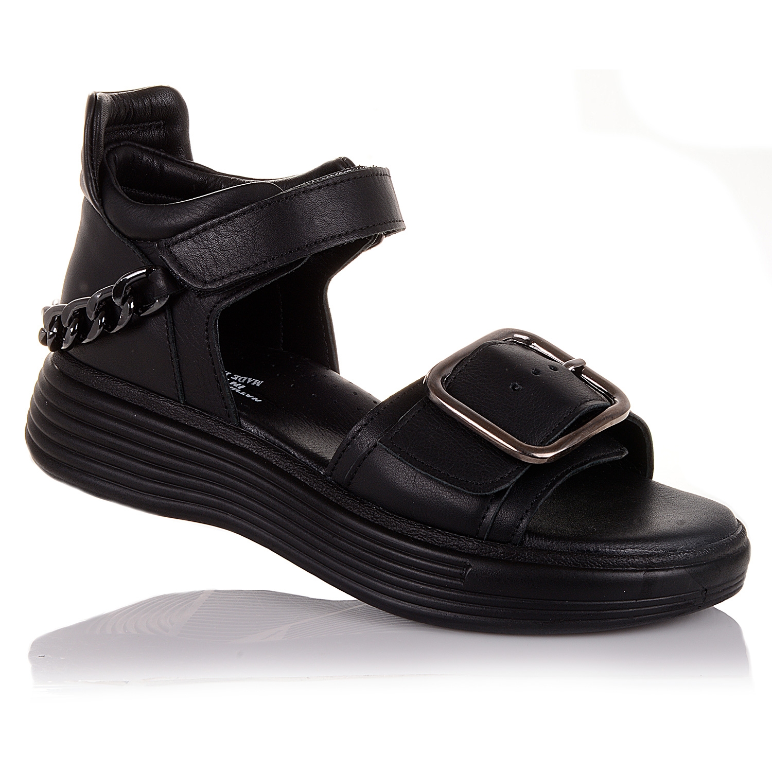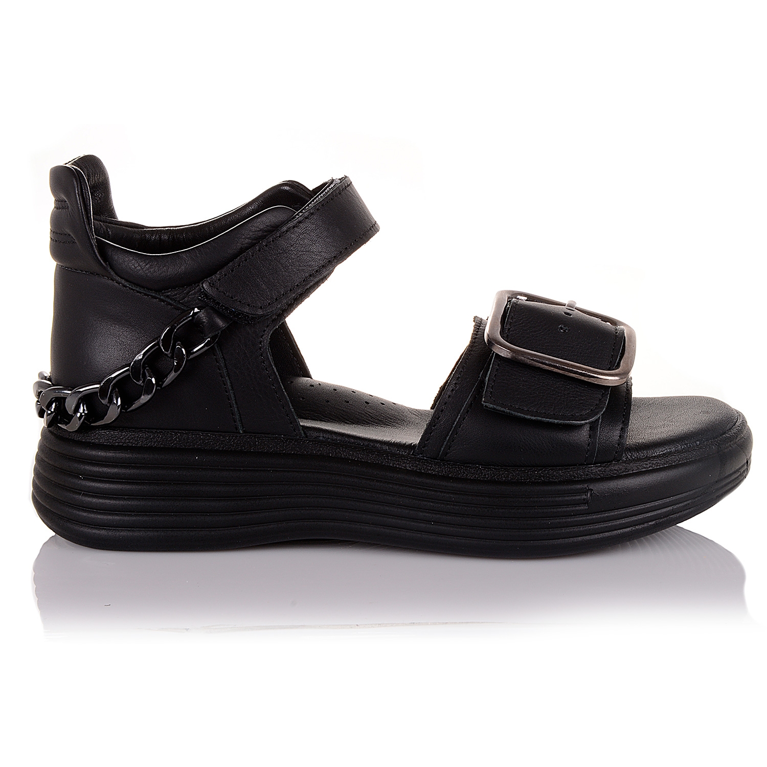 Бажаєте купити дитяче взуття на міцній, легкій підошві? Тоді це саме ті босоніжки для дівчат, які вам потрібні. Взуття зроблено з натуральної шкіри чорного кольору. Також взуття для дітей прикрашено металевим декором на широкій передній шлейці та заднику. До речі, сам задник жосткий, а разом із супінатором вони підтримують стопу дитини у правильному фізіологічному положенні. Липучка у дитячих босоніжках одна, регулюється в області гомілки.