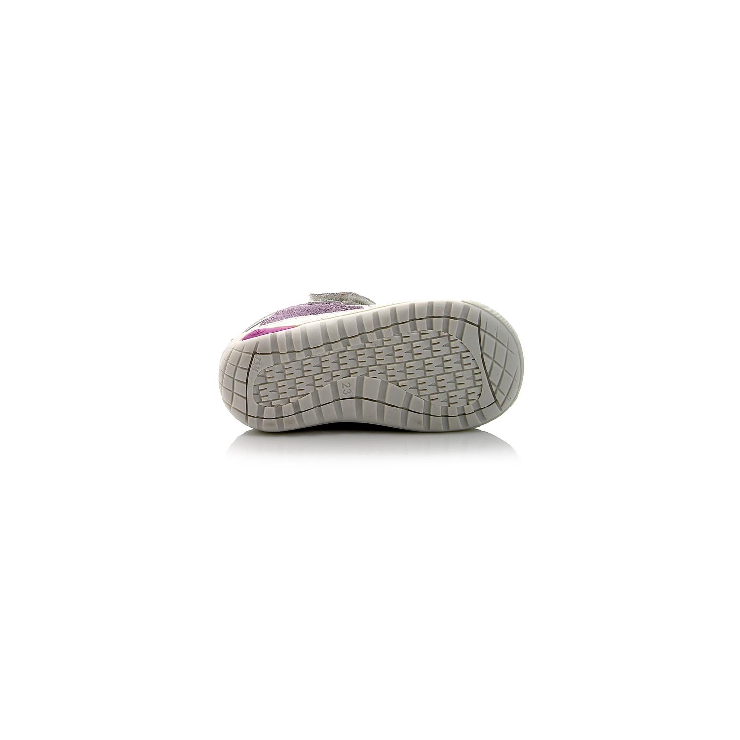 Мокасины Minimen белого цвета со светло-сиреневой вставкой, на липучке. Внутри и снаружи кожаные, есть супинатор и твердая пятка.