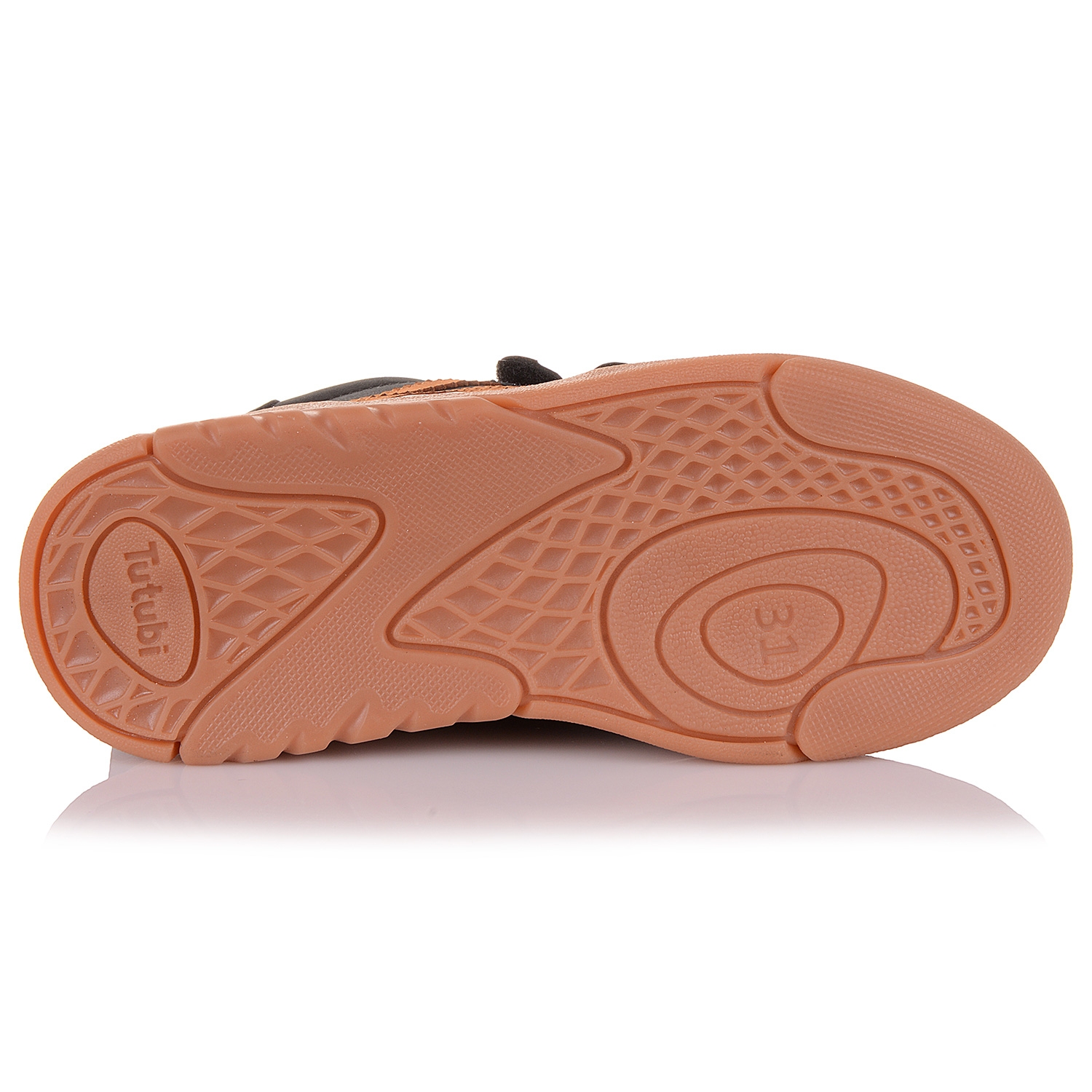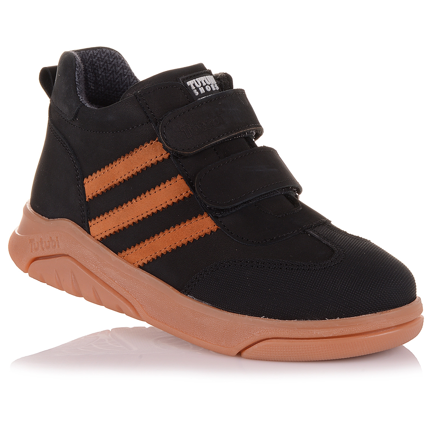 Тепер не потрібно шукати, де купити дитяче взуття! Модель виготовлена з натурального чорного нубука. У тон до підошви по боках нашито коричневий декор у вигляді тонких смужок. Внутрішня частина виробу і устілка зроблені з флісу. Цей матеріал здатний утримувати тепло, забезпечує м'якість і сухість всередині черевика. Підошва з термоеластопласту захищає стопу від пошкоджень, не ковзає. Липучки дозволяють швидко і надійно зафіксувати взуття на осінь ногах.