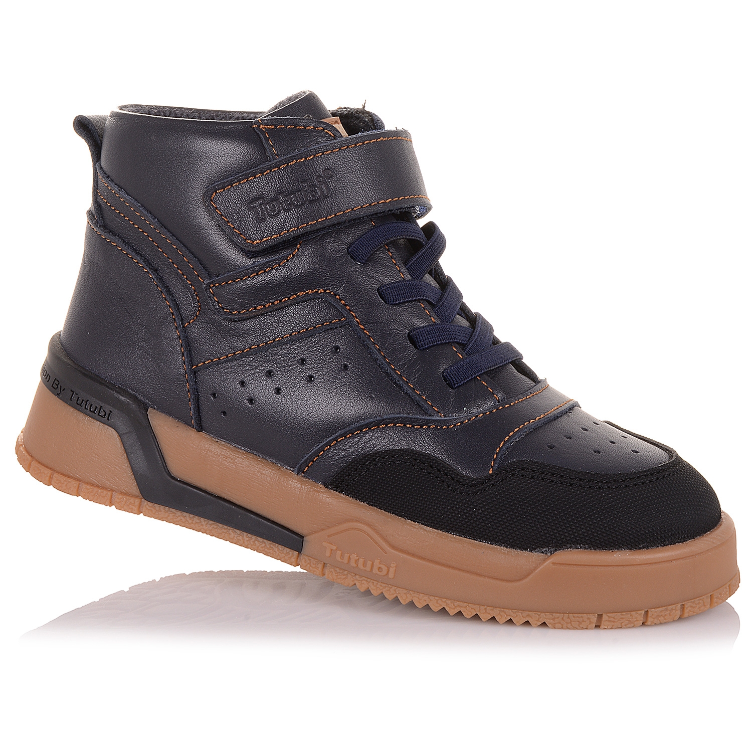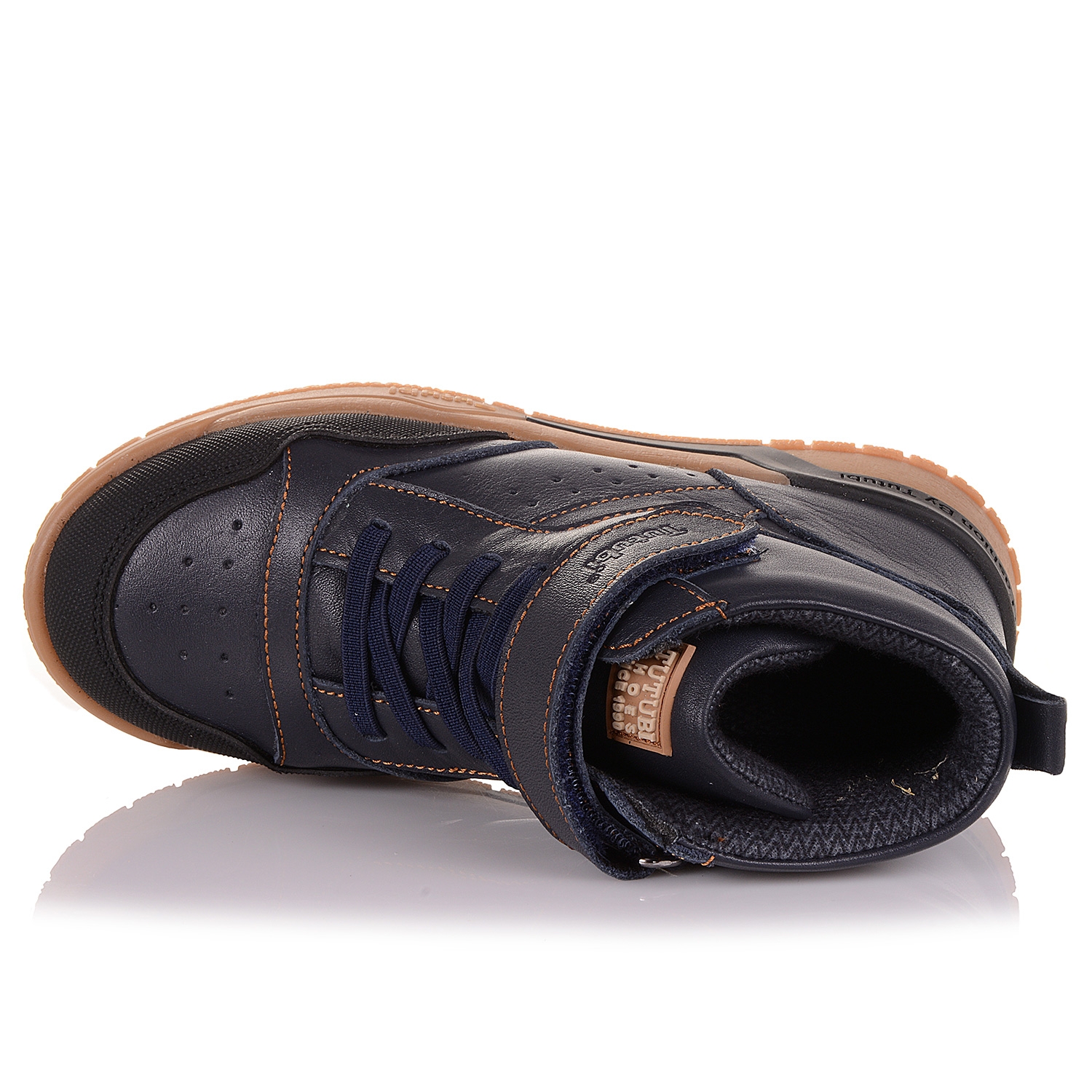 Дитяче демісезонне взуття для хлопчиків виготовлено з натуральної шкіри синього кольору. Внутрішня частина виробу утеплена флісом, тож взуття довго зберігає тепло і забезпечує оптимальну терморегуляцію. Практична коричнева підошва дозволяє рівномірно розподілити навантаження по всій стопі, а жорсткий задник та супінатор правильно фіксують п'яту і голеностоп. Взуття на осінь легко закріпити на ніжках за допомогою липучки. Під нею знаходятся резинки. Носок захищений гумовою накладкою.