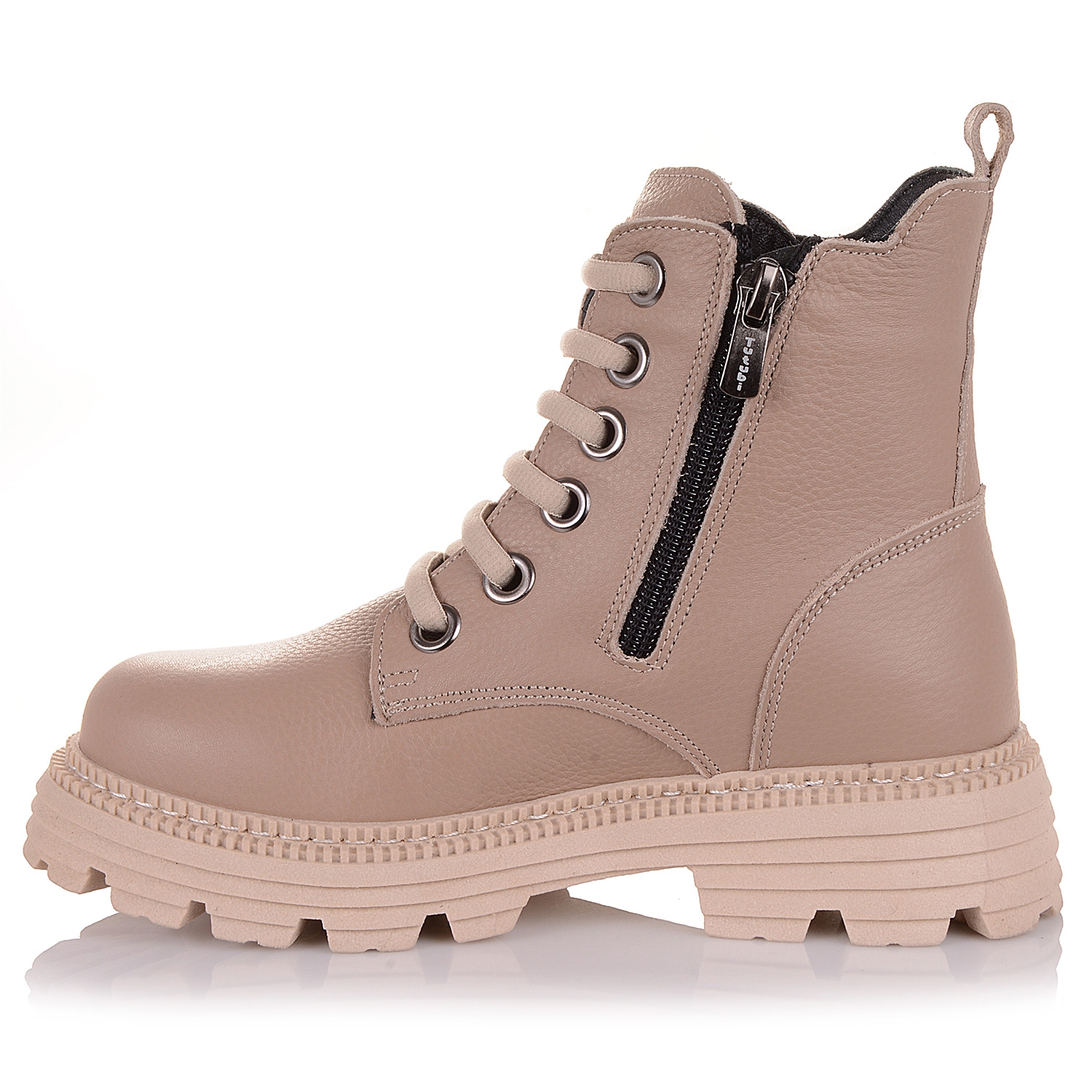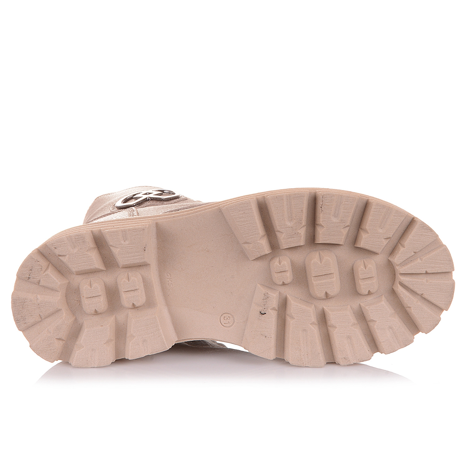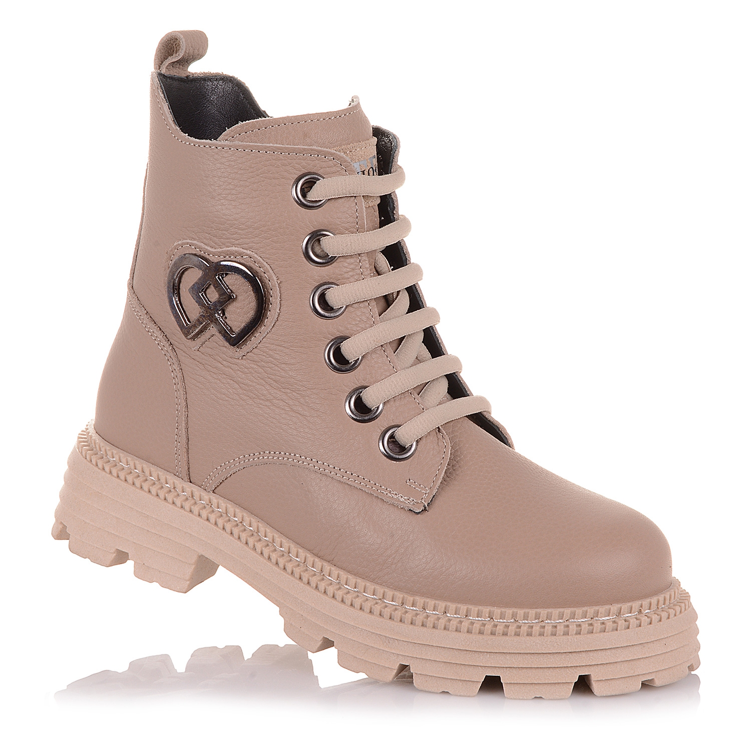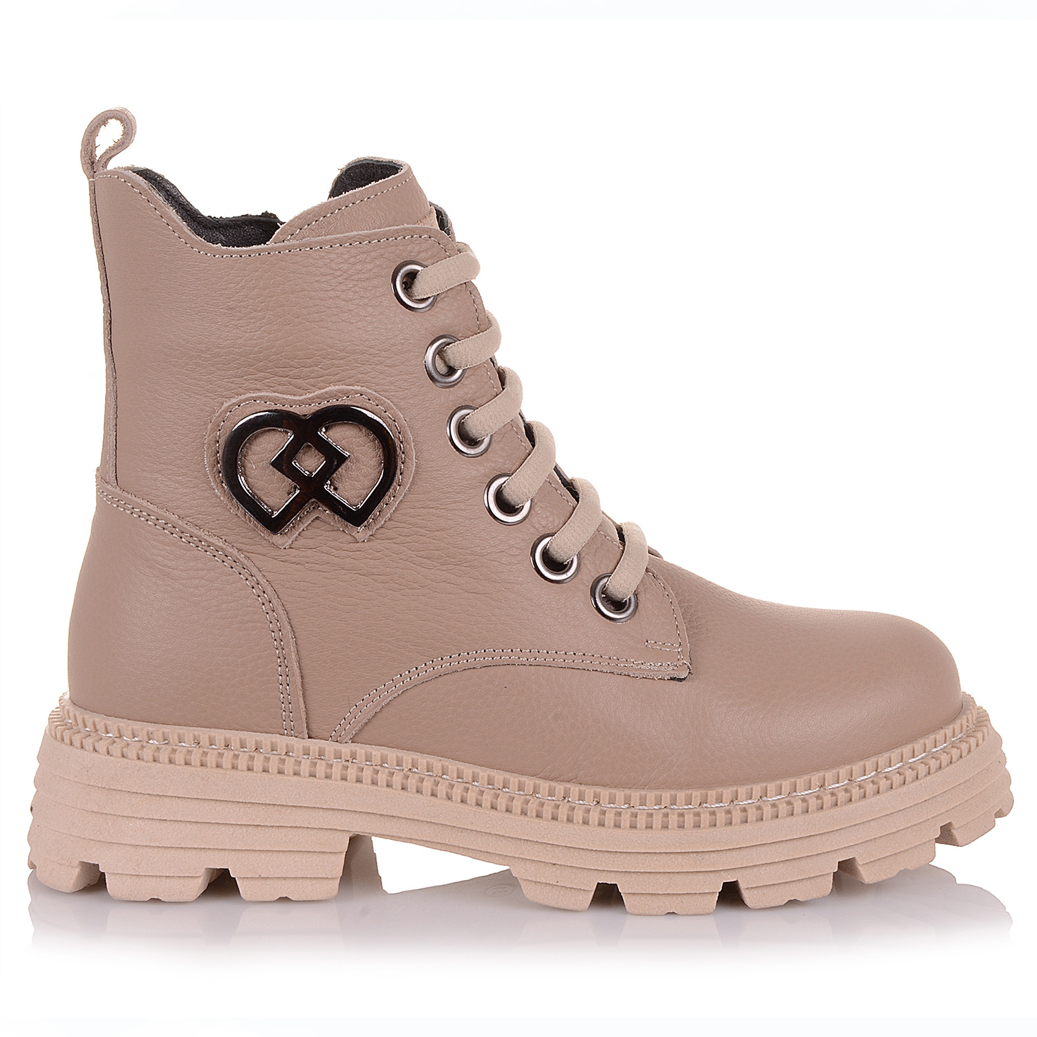 Дитяче взуття для зими має бути теплим, стійким та комфортним. Черевики для дівчаток дуже гарного бежевого кольору зроблено з натурадльно шкіри. Внутрішня частина виробу і устілка зроблені з натурального хутра. Це означає, що навіть в морозну погоду дитячим ніжкам буде тепло і комфортно. Тракторна підошва з термоеластопласту рівномірно розподіляє навантаження по всій стопі, підтримуючи її середню частину, перешкоджає ковзанню. Завдяки шнурівці і бічній блискавці взуття надійно фіксується на нозі. Супінатора та потовщений задник присутні у моделі.