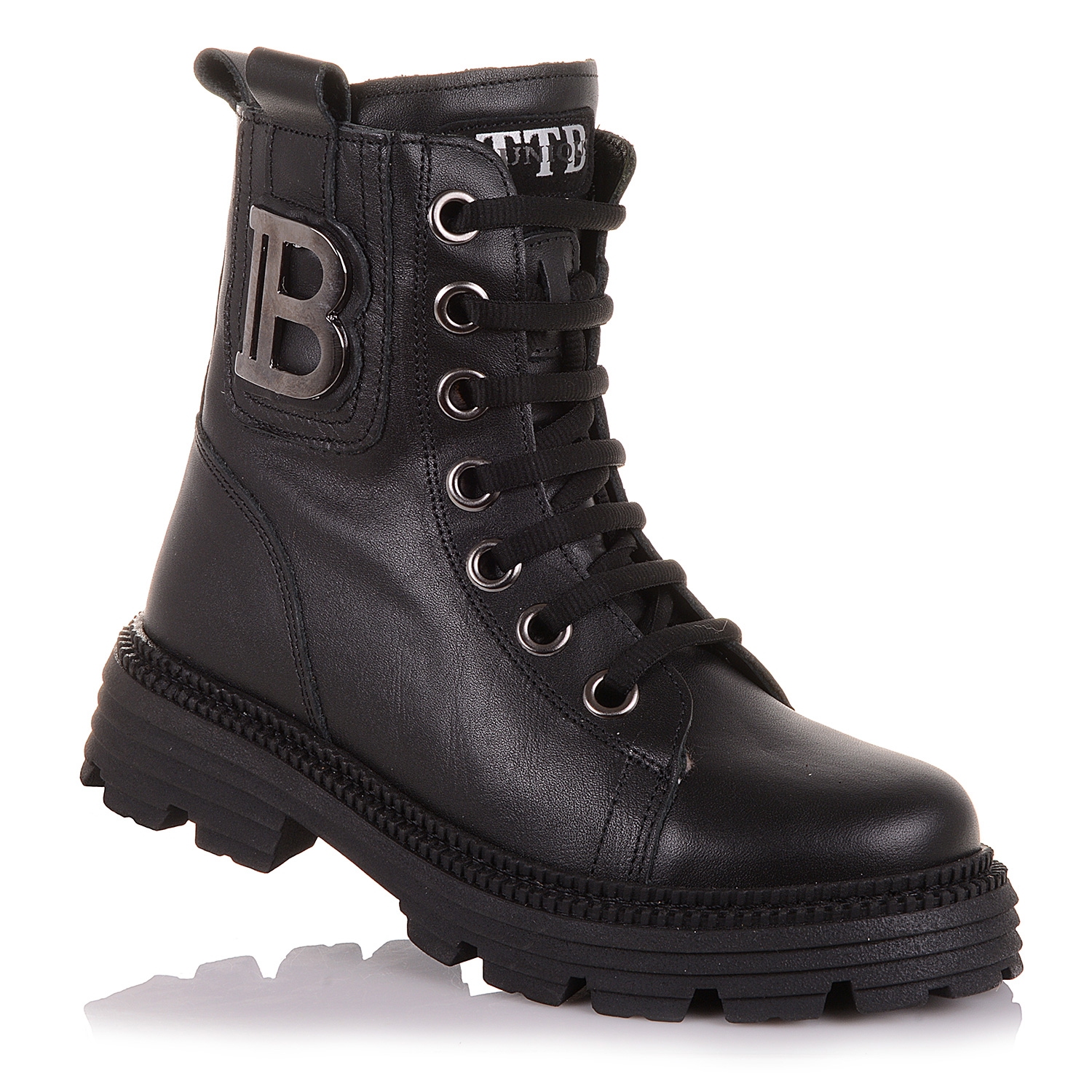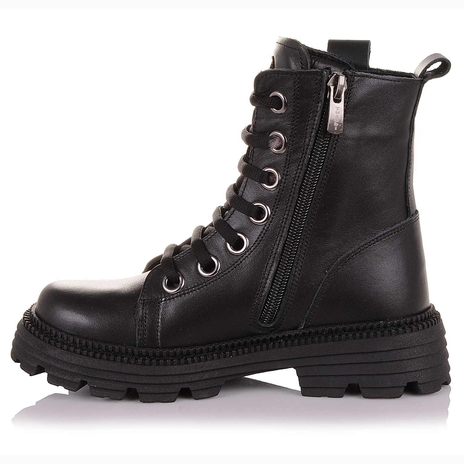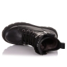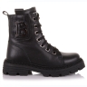 Взуття для дітей зимове на масивній підошві гарантує теплі і сухі ноги навіть в саму вогку, дощову погоду. Черевики для дітей виконано з натуральної шкіри чорного кольору. Всередені взуття та устілка вкриті теплим, натуральним хутром. Жорсткий задник і супінатор фіксують п'яту і голеностоп, а також запобігають появі розтягнень і вивихів. Черевики фіксуються на ногах за допомогою шнурків і блискавки збоку. Підошва з термоеластопласту перешкоджає ковзанню і захищає стопу від пошкоджень.
