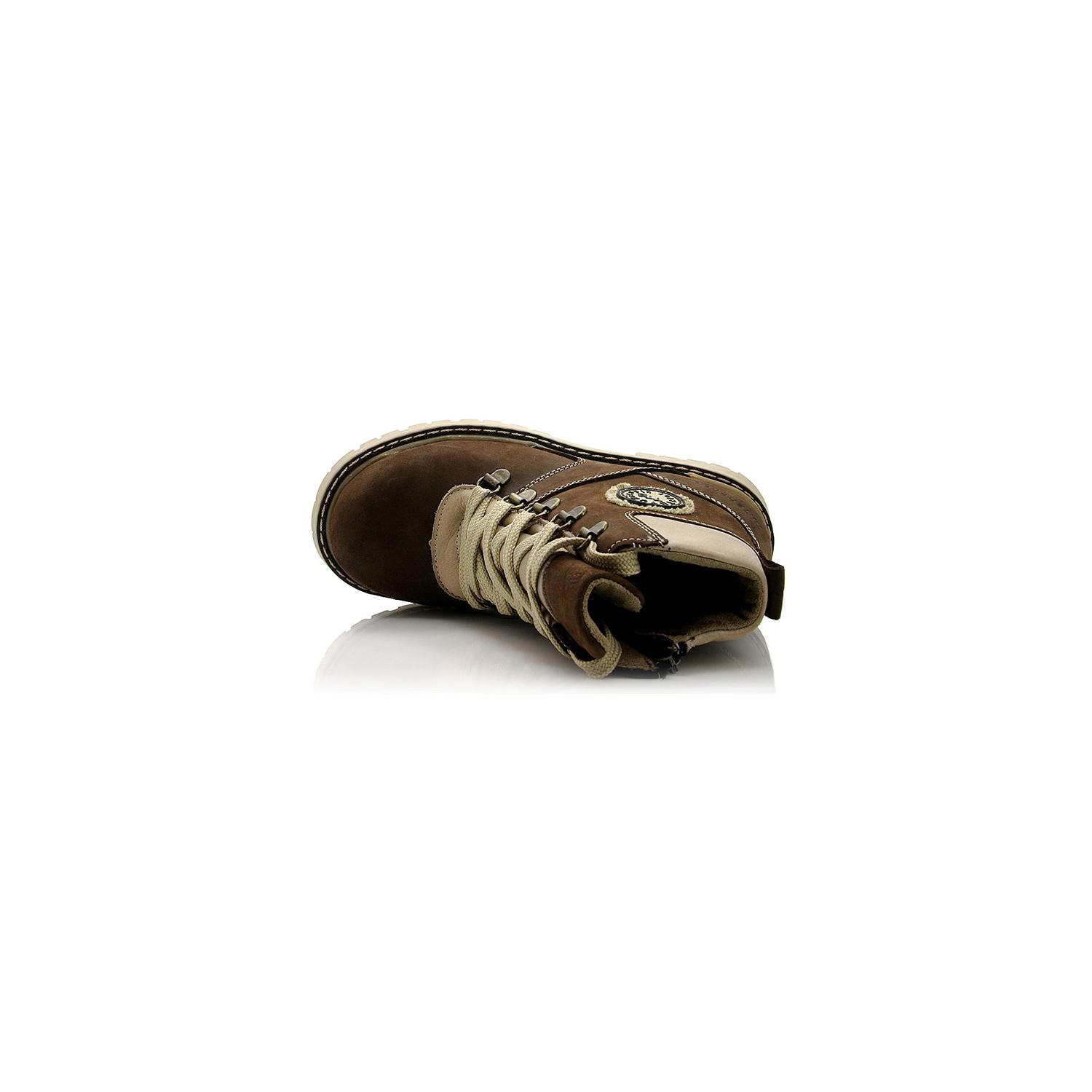Ботинки темно-коричневого (шоколадного) цвета. Сверху фиксируются шнурками, сбоку на молнии. Снаружи жирный нубук, внутри утепленные флисом. Высокая твердая пятка, супинатор и тракторная не скользящая подошва.
