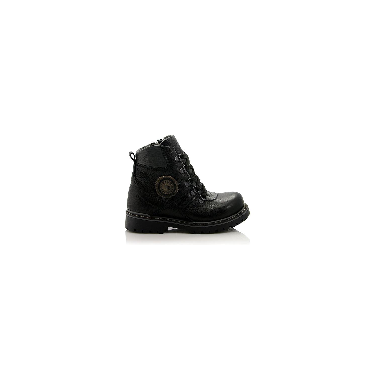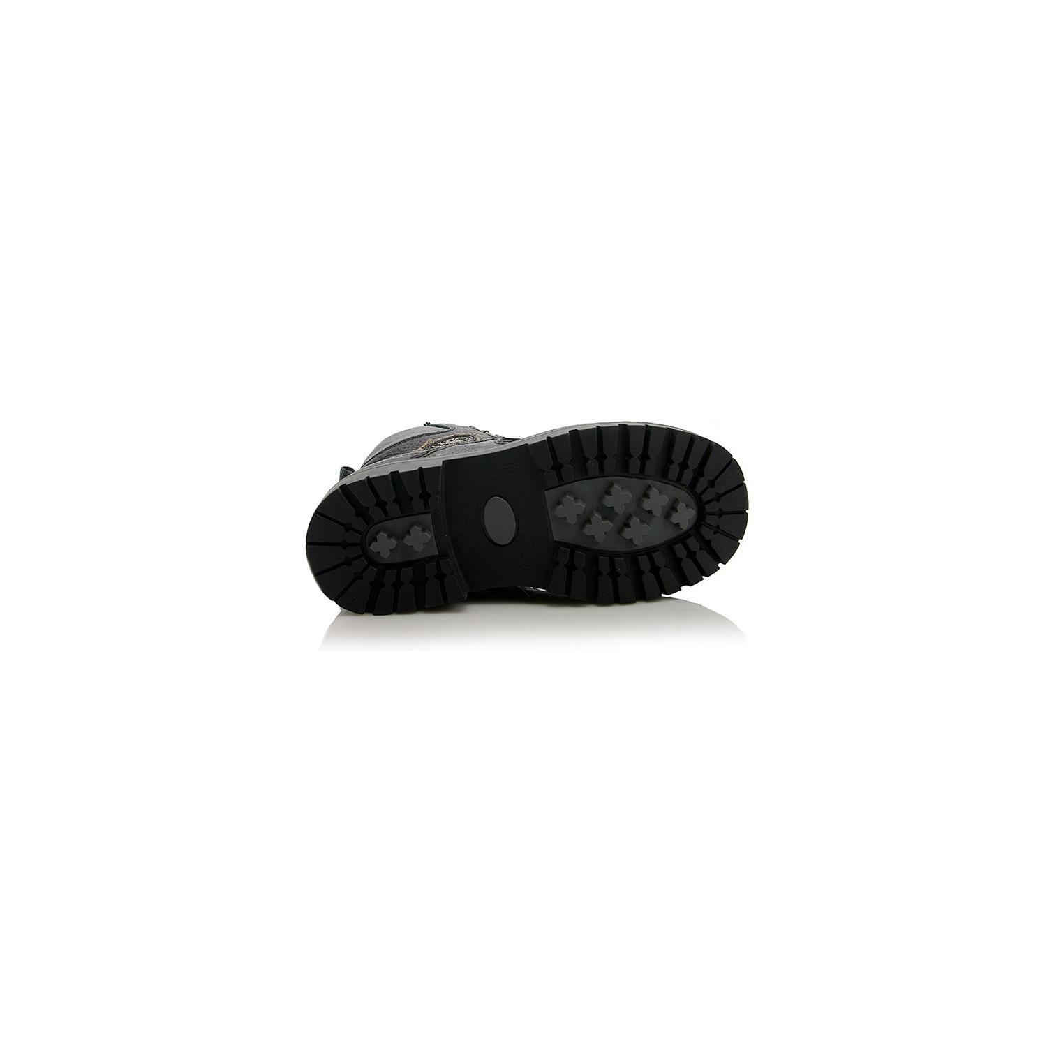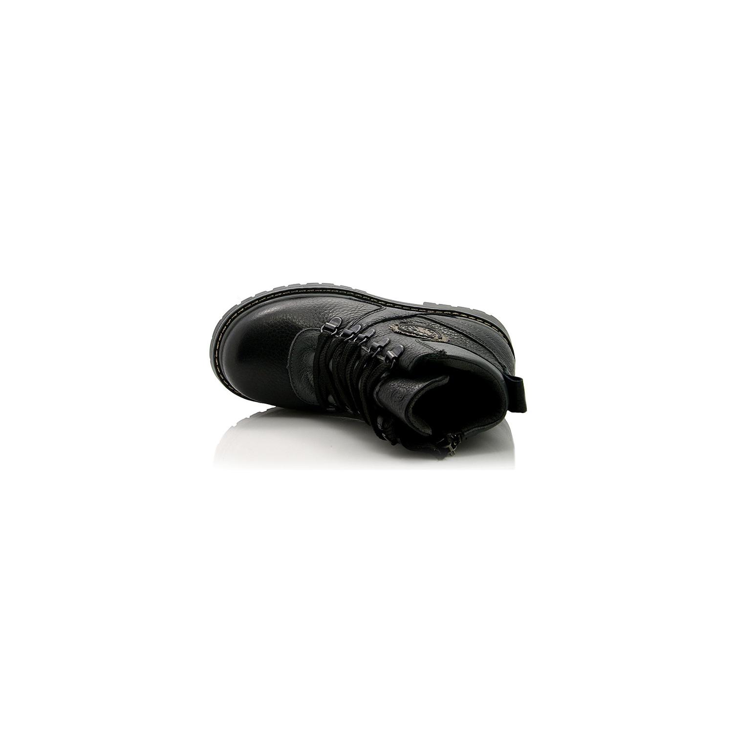Ботинки черного цвета. Сверху фиксируются шнурками, сбоку на молнии. Снаружи кожа, внутри утепленные флисом. Высокая твердая пятка, супинатор и тракторная не скользящая подошва.