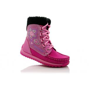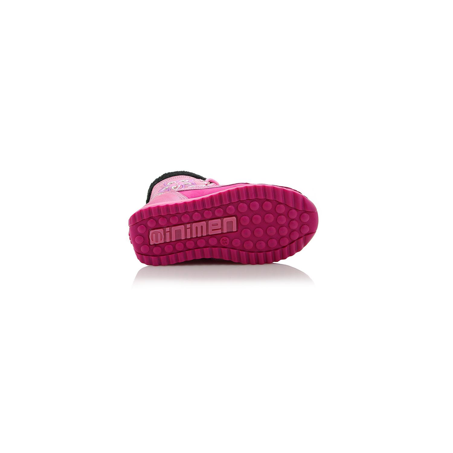 Полусапожки Minimen розового цвета с цветочком. Сверху фиксируются шнурками, сбоку на молнии. Снаружи жирный нубук, внутри - 100% шерсть. Есть твердая пятка, супинатор и не скользящая подошва.
