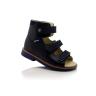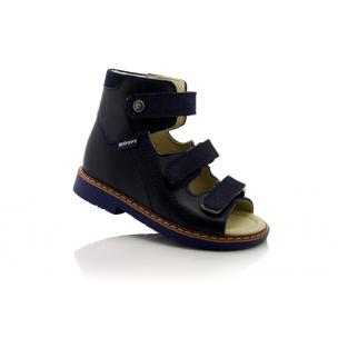 Босоножки ортопедические темно-синего цвета (с высоким берцем) и открытым носком. Сверху фиксируются тремя липучками. Снаружи кожа + нубук, внутри кожаные. Завышенная твердая пятка, супинатор и ортопедический каблук Томаса.