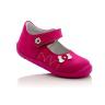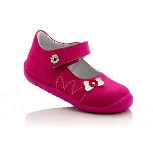Туфли розового цвета с белым цветком. Сверху регулируются липучкой. Снаружи нубук, внутри кожаные. Есть твердая пятка и супинатор.