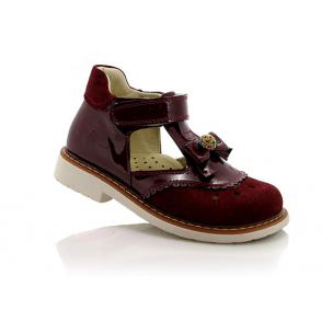 Босоножки ортопедические с закрытым носком темно-вишневого (бордового) цвета. Сверху регулируются липучкой. Снаружи кожа (лак) + замша, внутри - кожаные. Высокая твердая пятка, супинатор и ортопедический каблук Томаса.