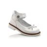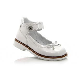 Туфли ортопедические лакированные белого цвета. Сверху регулируются липучкой. Снаружи и внутри кожаные. Высокая твердая пятка, супинатор и ортопедический каблук Томаса.