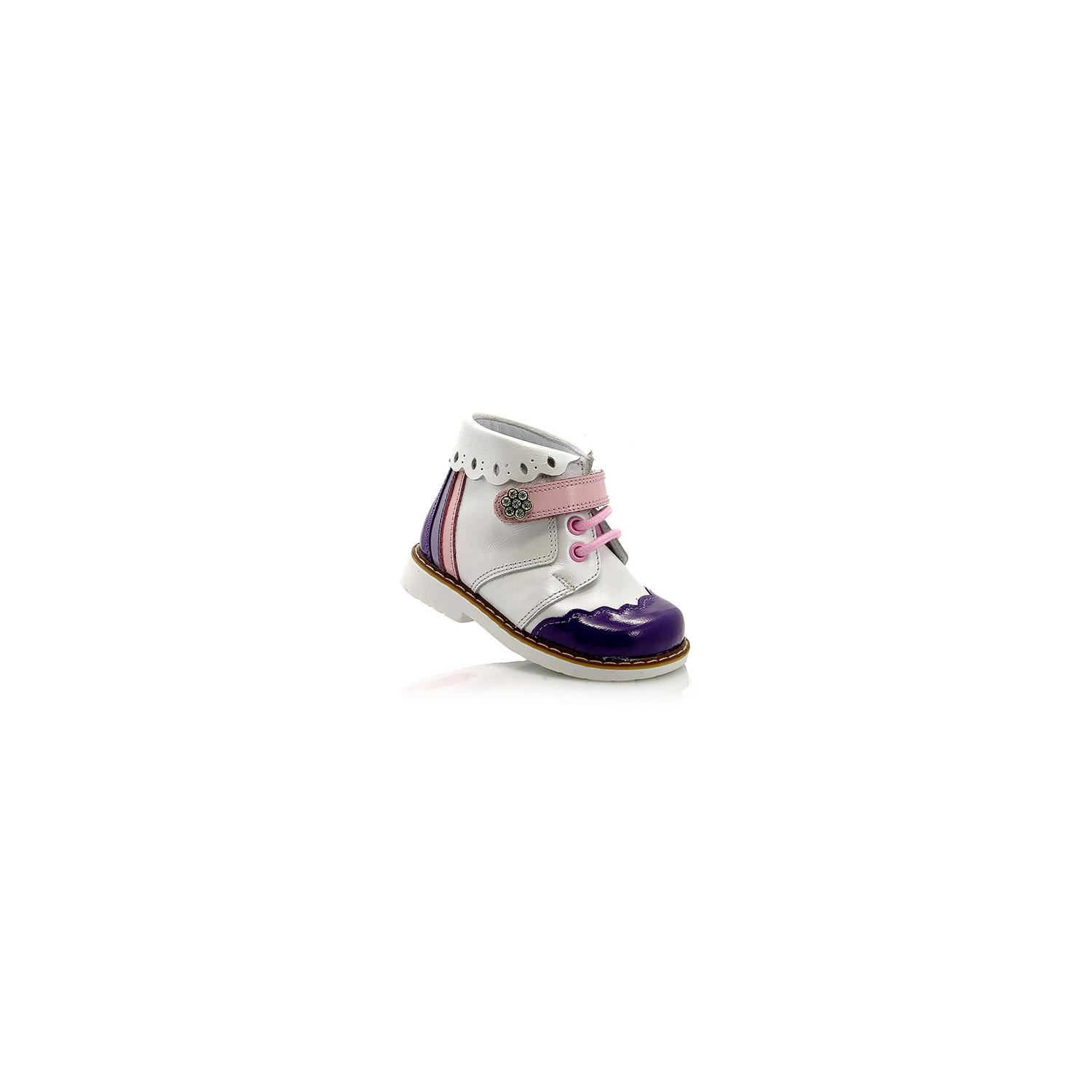 Ботинки ортопедические белого цвета с цветными вставками. Сверху регулируются шнурками и липучкой. Снаружи кожа, внутри - флис. Высокая твердая пятка, супинатор и ортопедический каблук Томаса.