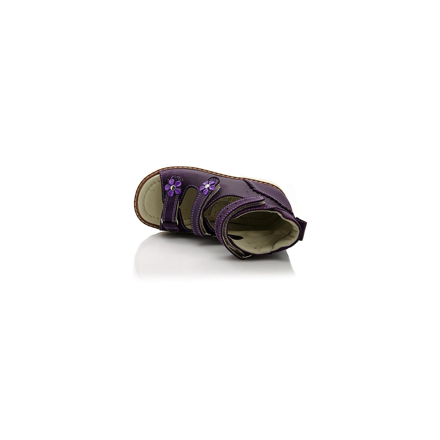 Босоножки ортопедические фиолетового цвета (с высоким берцем) и открытым носком. Сверху фиксируются тремя липучками. Снаружи - жирный нубук, внутри кожаные. Завышенная твердая пятка, супинатор и ортопедический каблук Томаса.