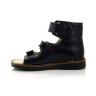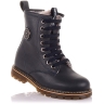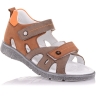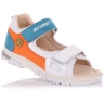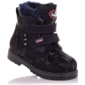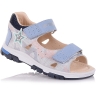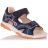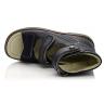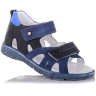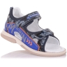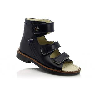Босоножки ортопедические темно-синего цвета (с высоким берцем) и открытым носком. Сверху фиксируются тремя липучками. Снаружи кожа и внутри кожаные. Завышенная твердая пятка, супинатор и ортопедический каблук Томаса.