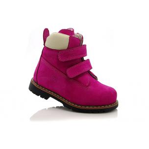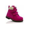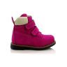 Зимние ботинки ярко-розового цвета. Сверху фиксируются двумя липучками. Снаружи нубук, внутри натуральный мех - цигейка. Высокая твердая пятка, супинатор и ортопедическая не скользящая подошва.