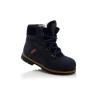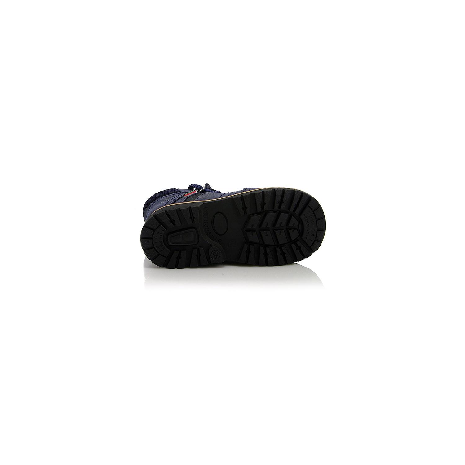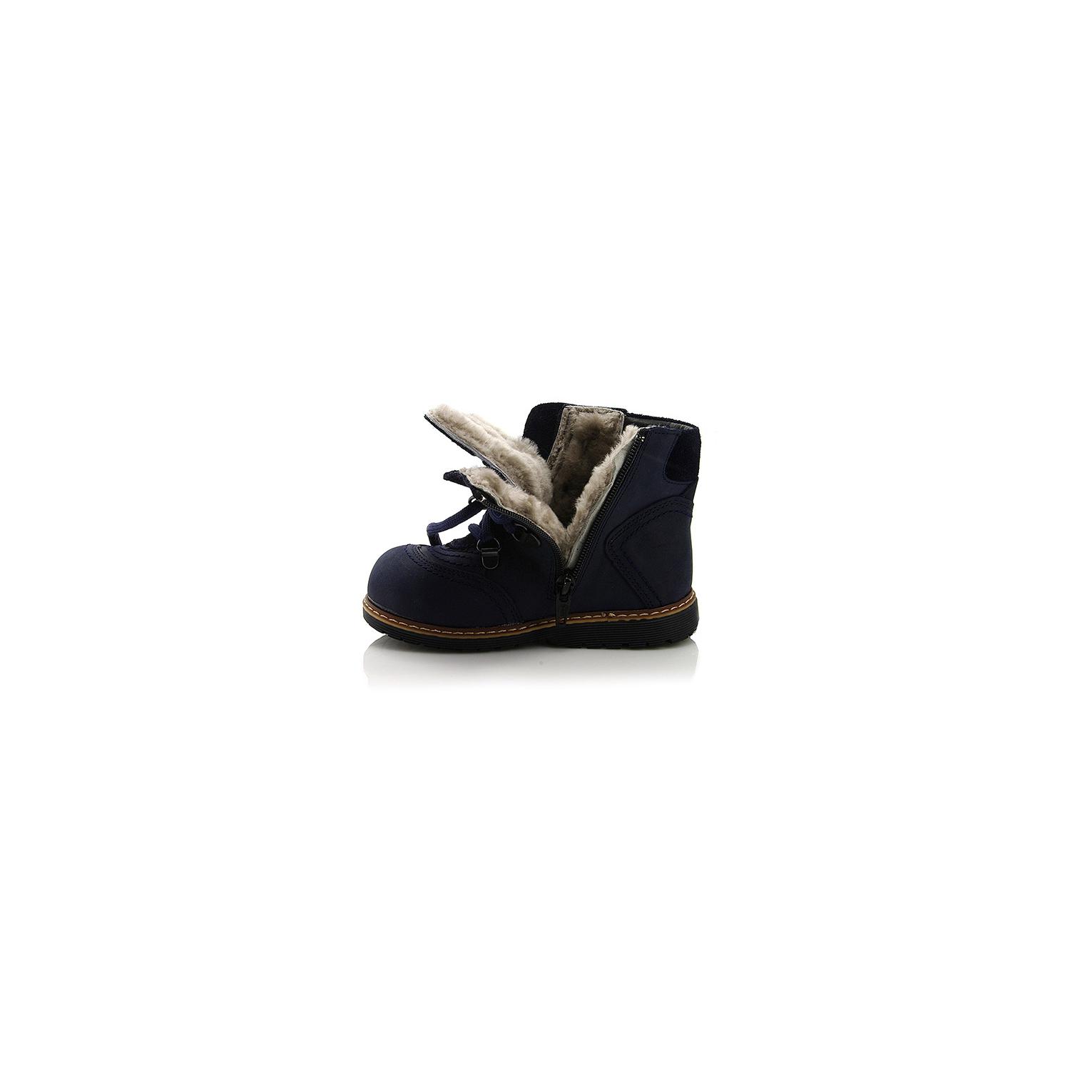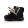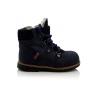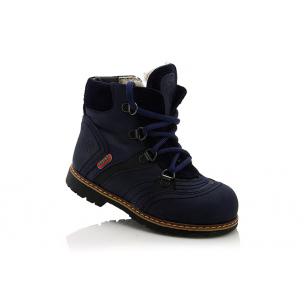 Зимние ботинки темно-синего цвета. Сверху фиксируются шнурками, с внутренней стороны на молнии. Снаружи жирный нубук, внутри натуральный мех - цигейка. Высокая твердая пятка, супинатор и ортопедическая не скользящая подошва.