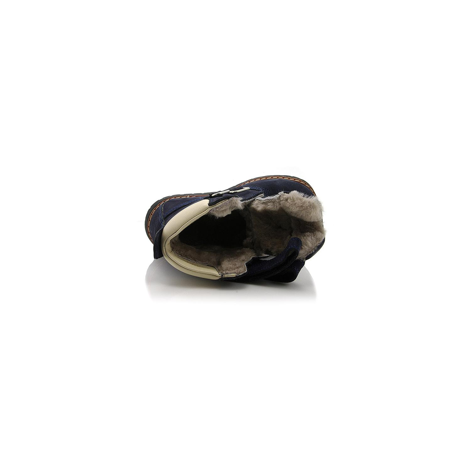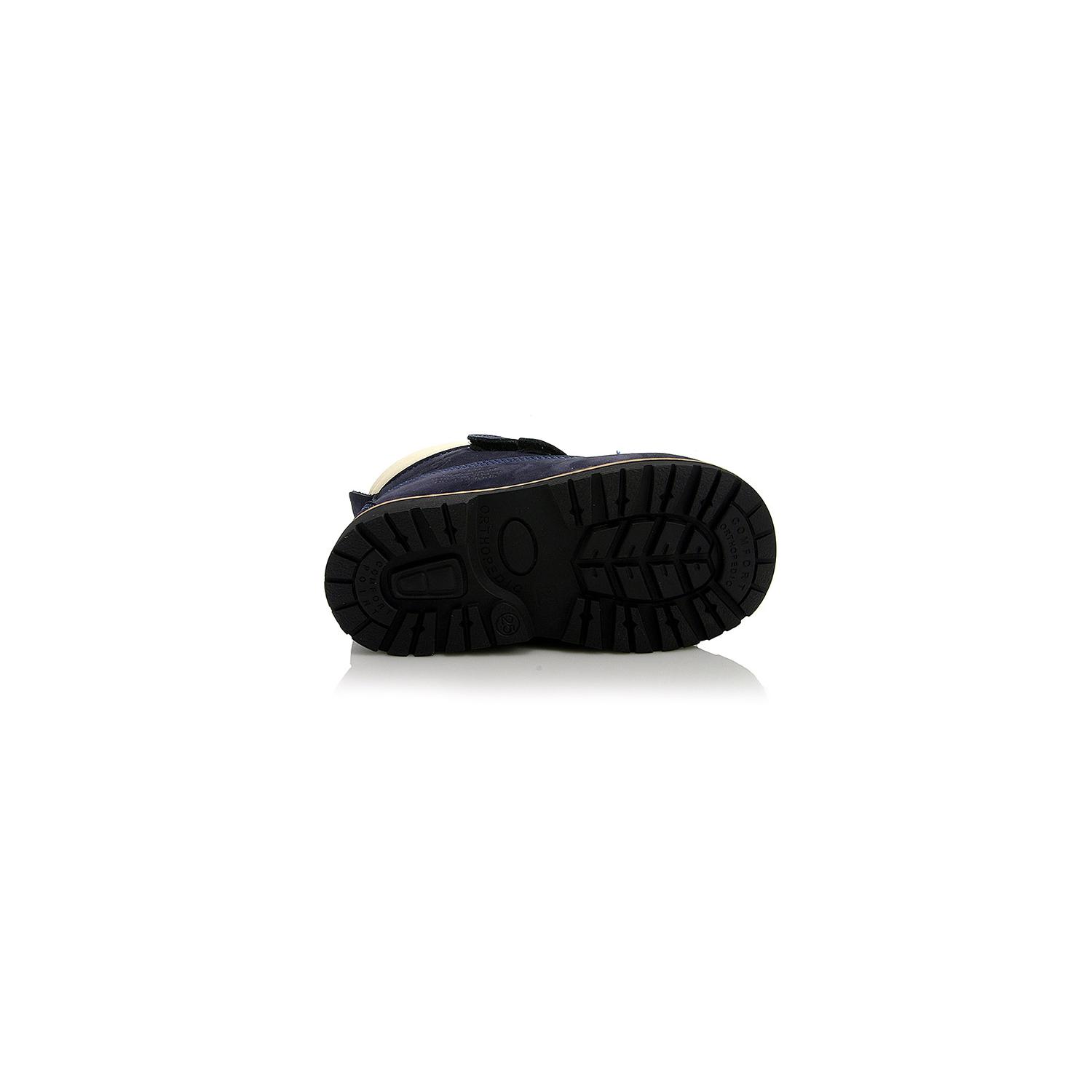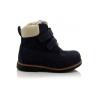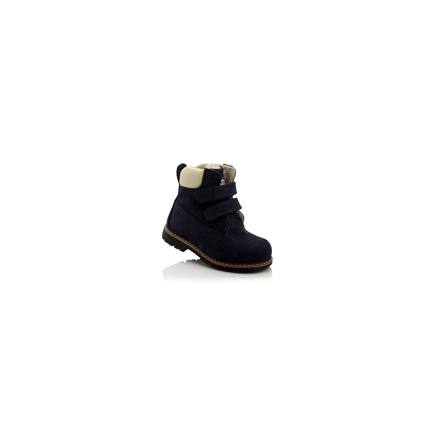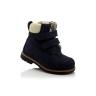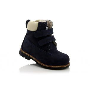 Зимние ботинки темно-синего цвета. Сверху фиксируются двумя липучками. Снаружи нубук, внутри натуральный мех - цигейка. Высокая твердая пятка, супинатор и ортопедическая не скользящая подошва.